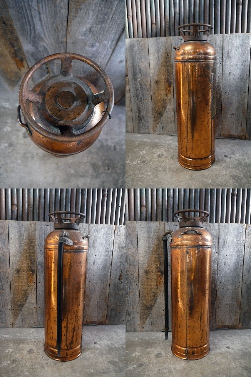 アメリカで買い付けてきましたアンティークのRED STARメタル消火器です。重厚感のあるメタルの風合いとアメリカンなプレートロゴ&デザインが抜群の雰囲気がありますのでディスプレイにおすすめです。中身は入っていません。オリジナルのホースで、内側容器&金具も付属します。年代の表記はありませんがデザインから1940年代頃になるかと思います。状態ですが、多少の傷、画像の様にホースの多少の硬化劣化や歪み、錆びや汚れなどはみられるもの全体的にはアンティークならでの雰囲気でディスプレイには問題ない状態で良いです。あくまでアンティークジャンクになりますのでご理解いただける方のご購入をよろしくお願い致します。