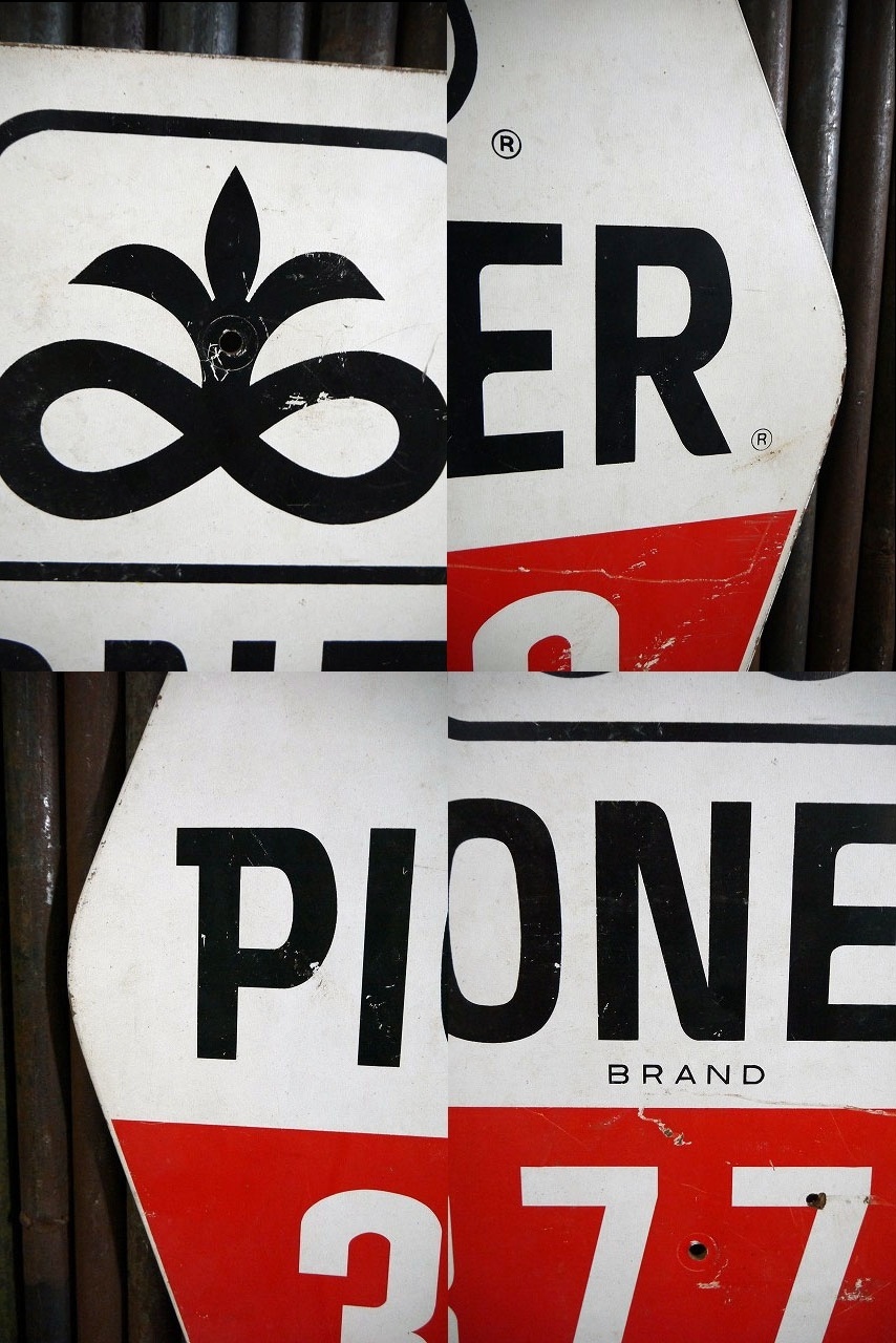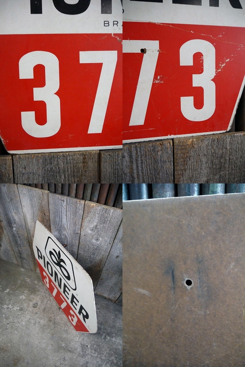 アメリカで買い付けてきましたビンテージのPIONER BRAND 看板です。リアルな風合いとシンプルなロゴデザインがビンテージならではのとても良い雰囲気です。圧縮ペーパーボード素材で、畑等で実際に使用されていた看板になります。表記はありませんがデザインから1970年代頃になるかと思います。状態ですが画像の様に傷、汚れ、サビや歪み、塗装剥がれや周囲に細かいカケやなどは使用感はありますがビンテージジャンク好きな方でしたら問題レベルでディスプレイには問題ない雰囲気のある状態で良いです。あくまでビンテージになりますのでご理解いただける方のご購入をよろしくお願い致します。