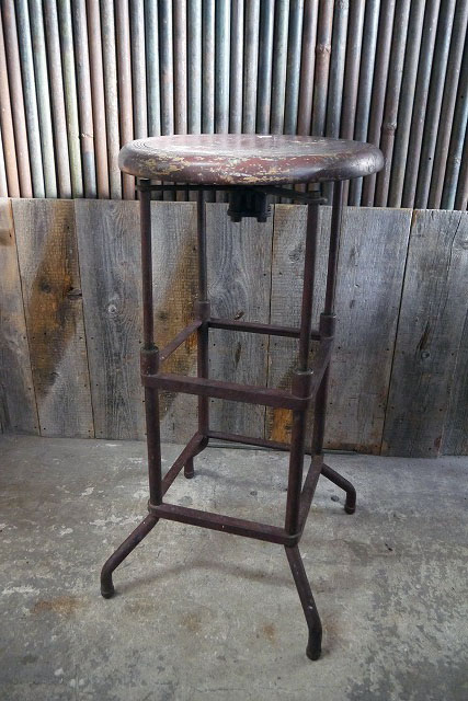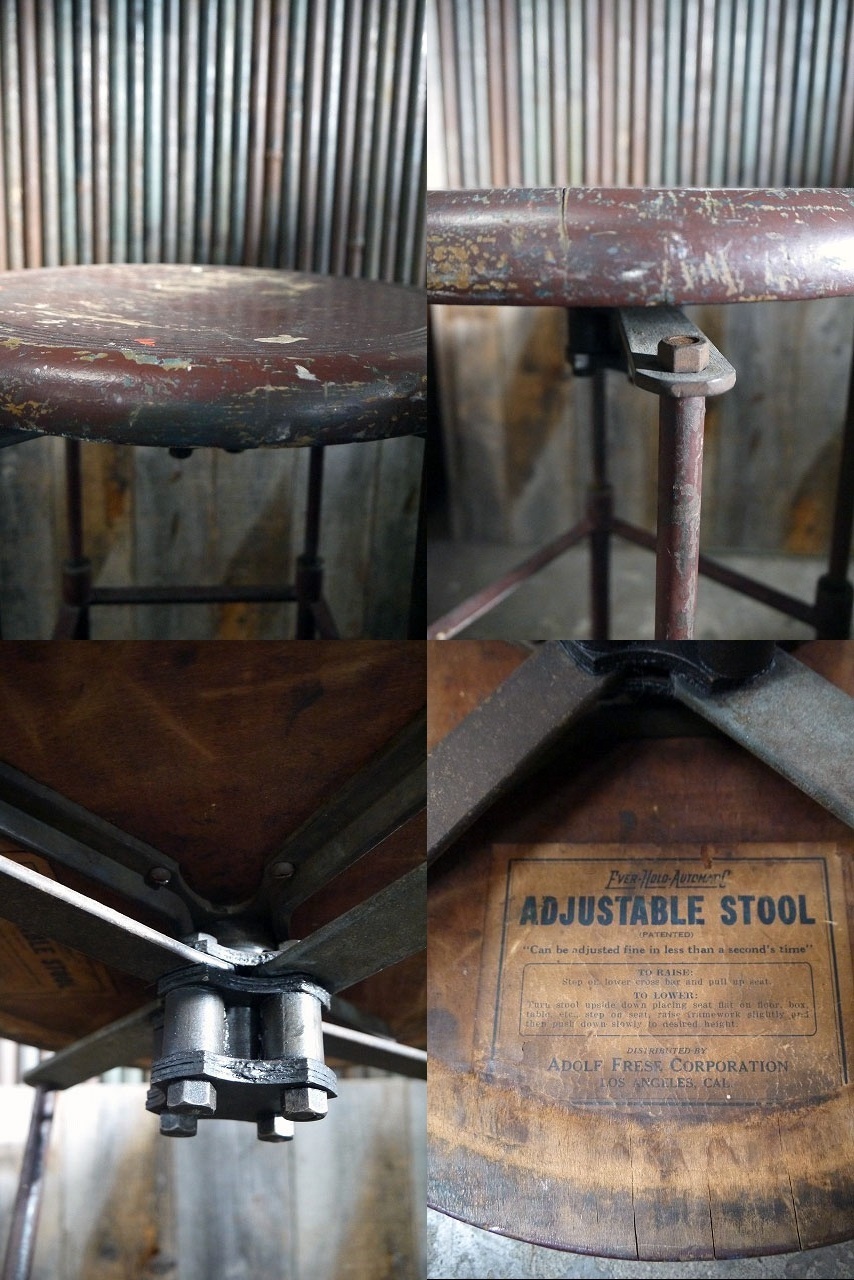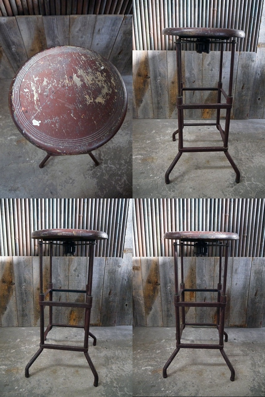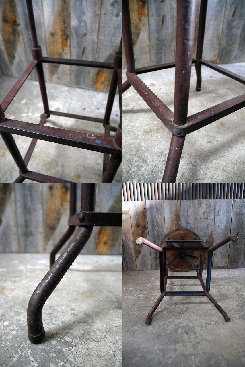 アメリカで買い付けましたアンティークのスツールです。アメリカのインダストリアルメーカーデザインで、円形のウッド座面に、重厚感のあるメタル脚のデザインフォルムもおしゃれでリアルな風合いが最高に雰囲気があります。元々は高さ調節が出来るデザインですが、恐らく壊れていて高さ調整はできません。非常にしっかりした素材と作りですので雰囲気よくお部屋からショップの店舗什器として幅広くおすすめです。年代の表記はありませんがデザイン、裏面のペーパーから推測して1930年代頃になるかと思います。状態ですが経年による金属劣化や塗装の剥がれ、ペンキ散り、天板座面ウッドに多少の反りや接合部分に多少の隙間やひび割れ、傷や汚れ、錆や高さ調整不可等はございますが雰囲気を損なうようなダメージはなくアンティークならではの雰囲気のある状態です。あくまでアンティークジャンクですのでご理解いただける方のご購入をお願いします。