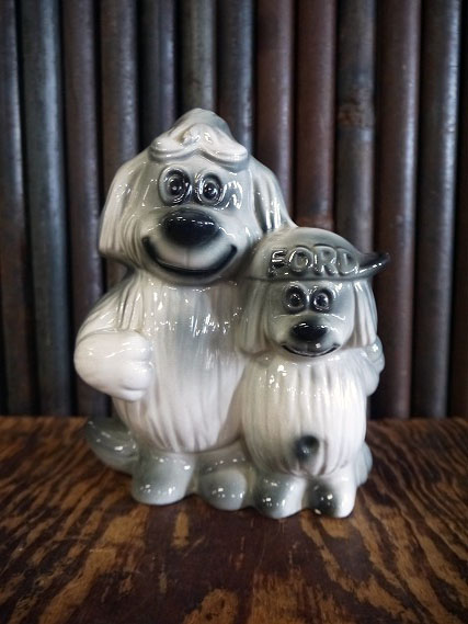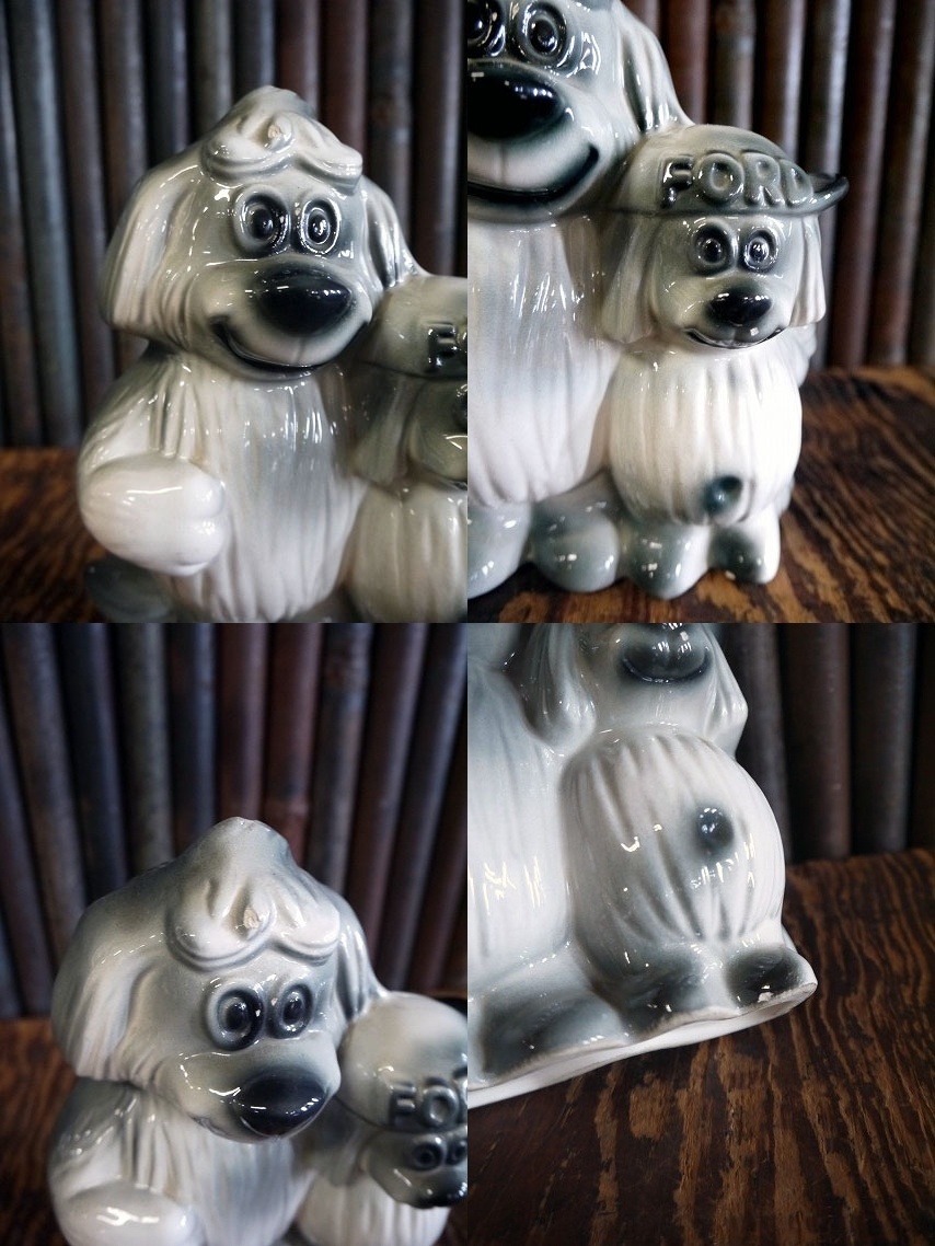 アメリカで買い付けてきましたビンテージのGalpin FORD キャラクタードール貯金箱です。人気MOTOR企業のマスコットキャラクターで、1958年から1970年代頃まで登場していた可愛いDOGモチーフのデザインになります。陶器素材で、年代の表記はありませんがデザインから1960年代前後頃かと思います。状態は経年による多少の擦れ、底面に多少の汚れや画像様に顔や足先に細かいカケなどはありますがそれ以外には特に目立つ様なダメージも無くディスプレイに問題ない状態で良いです。あくまでビンテージのためご理解いただける方のご購入をお願いします。