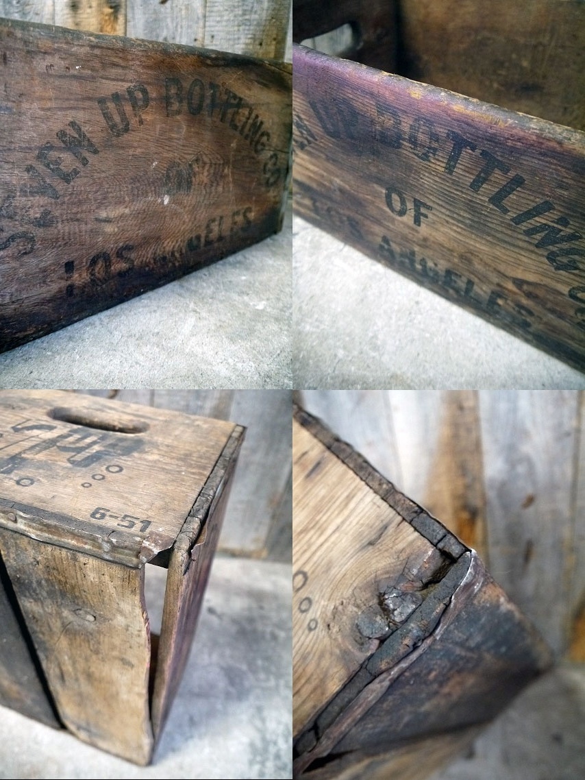アメリカで買い付けましたビンテージの7UPウッドボックスです。人気ドリンクメーカーのボトルケースで、アメリカならではのロゴデザインと木質のリアルな風合いが非常にかっこいいです。側面に6-51のスタンプ刻印がありますので1951年6月製になります。店舗什器やガーデニングなどのディスプレイ什器としてオススメです。状態ですが画像のように上側のや底、側面にひび割れ&カケ、傷や擦れ、色移り汚れ、金具にサビや歪み、ぐらつきなどはありますがディスプレイには問題ない雰囲気のある状態です。ただあくまでビンテージですので理解のある方のご購入をお願いします。