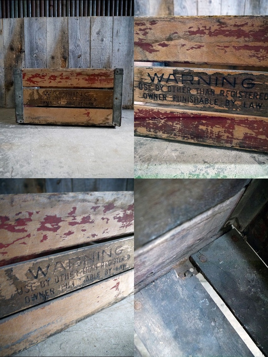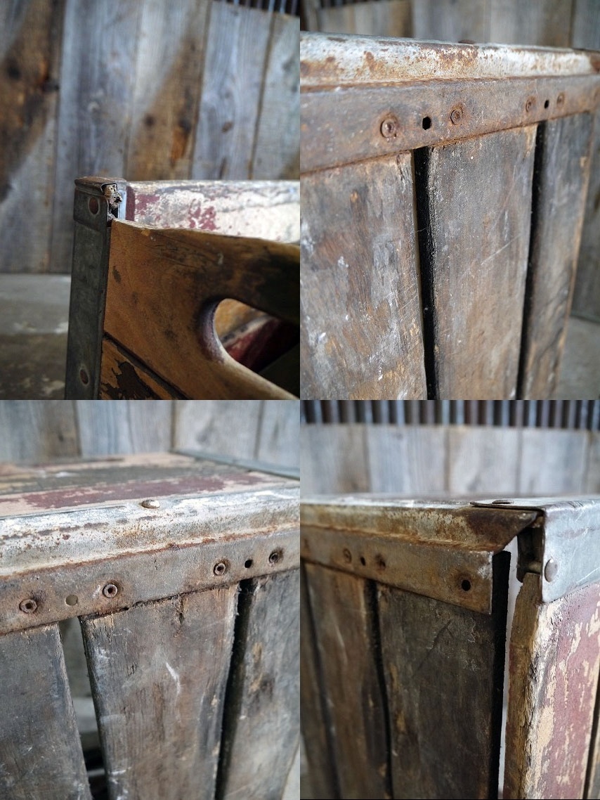 アメリカで買い付けたビンテージのArden Farms Coケースです。ウッド×メタルの風合いに、シンプルなロゴデザイン&ラインのぺイントもとても雰囲気があります。同型のものは重ねられる様になっていて、枠は重量のあるメタル製の非常にしっかりとした機能的な作りになります。9-61の表記がありますので1961年9月製になります。状態ですが、多少の傷、汚れやメタルにサビや多少の歪み、グラつき、画像の様な表面のカケ等ありますがしっかりとした作りで、実用ディスプレイ等には問題ない程度です。ただあくまでビンテージになりますのでご理解いただける方のご購入をお願いします。
