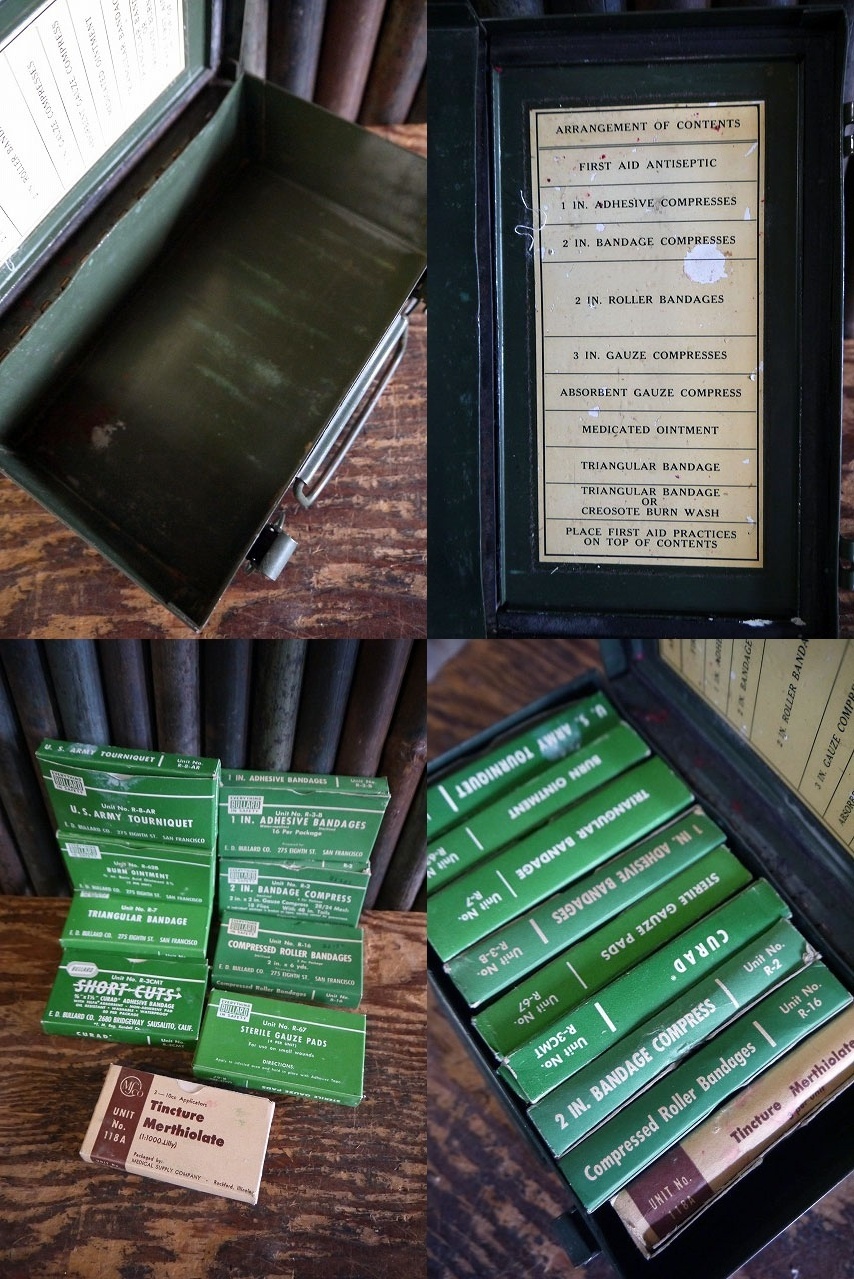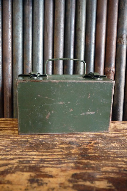 アメリカで買い付けましたビンテージのBELLSYSTEM FIRST AID メタルケースです。ミリタリーグリーンカラーにメタルの質感&ロゴデザイン&デカールデザインがとても雰囲気があります。アメリカBELLSYSTEM の簡易用救急箱で、年代の表記はありませんがデザインから1960年前後頃かと思います。上蓋はしっかりと閉まります。中身も付属しますが実用はできないと思いますのでディスプレイとしご使用下さい。お部屋等のディスプレイや鍵などの小物の収納BOXとしてもオススメです。状態ですが経年による多少の小傷、擦れ、多少の汚れはありますが、実用ディスプレイにも問題ない状態です。あくまでビンテージになりますのでご理解いただける方のご購入をよろしくお願いします。