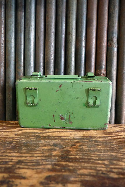 アメリカで買い付けましたビンテージのBullard FIRST AIDメタルケースです。淡いグリーン系カラーにメタルの質感&ロゴデザインルデザインがとても雰囲気があります。アメリカの簡易用救急箱で、年代の表記はありませんがデザインから1970年前後頃かと思います。上蓋&金具はしっかりと閉まります。中身は入っていません。お部屋等のディスプレイや小鍵などの小物の収納BOXとしてもオススメです。状態ですが経年による多少の小傷、擦れ、多少の汚れや消毒液の様な薬品の臭いはありますが、実用ディスプレイにも問題ない状態です。あくまでビンテージになりますのでご理解いただける方のご購入をよろしくお願いします。