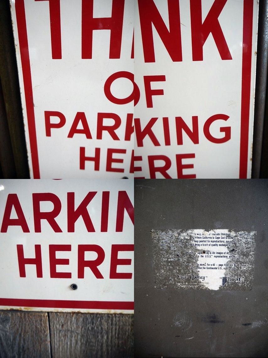アメリカで買い付けてきたビンテージのDONT EVEN THINKホーローロードサインです。ホワイト×レッドカラーのホーロー仕様で、リアルな傷がとても雰囲気がありかっこいいです。ホーローメタル(鉄)素材ですが、裏面やデザインから1990年年代頃に1950年代頃のホーローサインをモチーフに一般的に販売されていた看板になります。状態ですが傷、汚れ、錆び、取り付け穴付近に凹みやカケ、多少の反り、裏側の汚れはありますが、ジャンク好きの方でしたら恐らく問題ないレベルで雰囲気のある状態で良いです。 ただあくまでビンテージジャンクになりますので理解いただける方のご購入をよろしくお願いします。