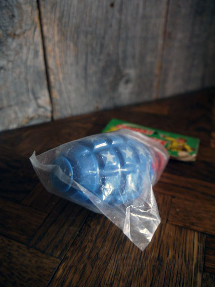 アメリカで買い付けましたビンテージのD,Stock COMBAT GRENADES TOYです。POPなカラーリングに手榴弾のSTARデザインがとても雰囲気があります。軽いプラスチック素材のHONG KONG製で、年代の表記はありませんがデザインから1970年頃かと思います。子供用のおもちゃで実際に使用可能かどうかは不明ですのでコレクション兼ディスプレイとしておすすめです。状態は未開封ですが多少のビニール包装に汚れ、ペーパーに色褪せ、汚れやフロント盤面に擦れくすみ等はありますが目立つダメージはなく雰囲気のある状態で良いです。あくまでビンテージジャンクですのでご理解いただける方のご購入をよろしくお願いします。