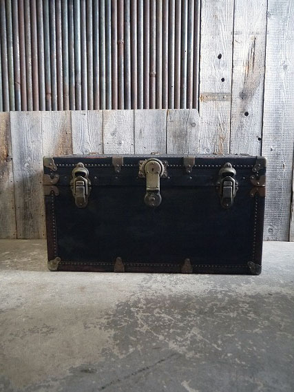 アメリカで買い付けてきましたアンティークのトランクケースです。渋い色褪せたブラックカラーに長年使い込まれたリアルでシャビーな風合い&ブランドロゴプレートデザインとても雰囲気があります。ウッド(表面はコットン生地)×レザー素材で、鍵は金具にて密閉するロックタイプで、オリジナルの鍵付き、鍵のロックや両サイドの金具はしっかりと閉まりますが土台部分に多少の歪みや膨張がありますので土台を押さえながら上蓋を閉めて、左右の金具も多少上蓋を押さえながら閉めて下さい。珍しいサイズ&台形型のデザインでビンテージ、アンティークショップ等の店舗等のディスプレイとしてお使い下さい。年代の表記はございませんが、デザインから1900年代初頭から1920年前後頃のトランクケースになるかと思います。状態ですが多少の傷や擦れ、トランク部分に多少膨張(ウッドの多少の膨らみ)画像の様な傷、サビ汚れ、レザー持ち手の劣化ダメージ、塗装剥がれ、内側の汚れ&剥がれやトランク特有の多少の臭いなどの使用感はありますがディスプレイには問題な雰囲気のある状態かと思います。あくまでアンティークジャンクですので理解のある方のご購入をお願いします。