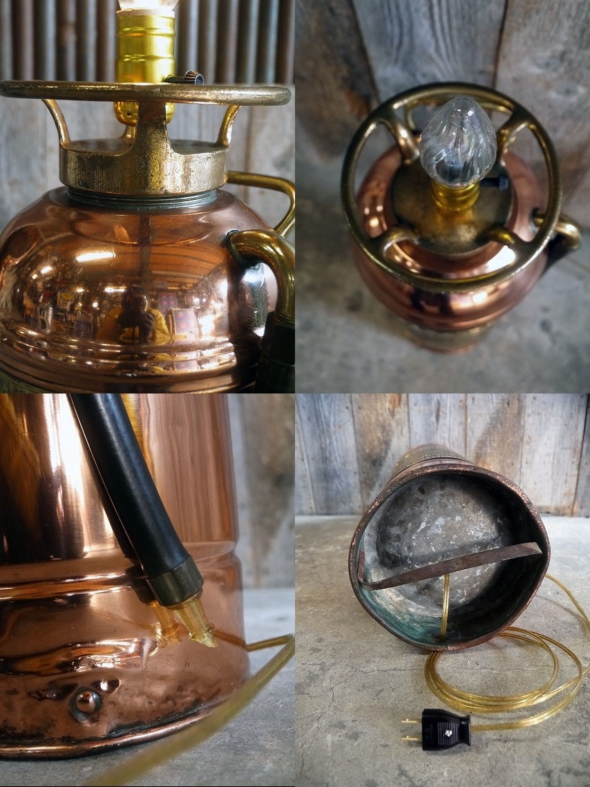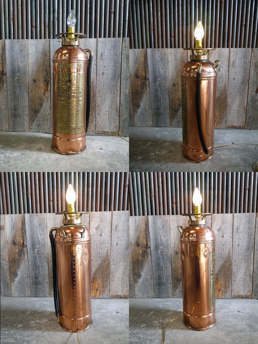 アメリカで買い付けてきましたアンティークのTHE BUFFALO消火器ランプです。ランプにリメイクされた消火器で重厚感のあるメタルの風合いとアメリカンなプレートロゴ&デザインが抜群の雰囲気がありますのでディスプレイにおすすめです。新品のソケット、通常コンセント、コードに交換済み、電球は付属しませんので市販の26mm口径の一般的なタイプですのでご用意ください。年代の表記はありませんがデザインから1940〜50年代頃かと思います。状態ですが、多少の傷、擦れ、サビ汚れ、ホース部分の曲がりや劣化、画像の様な凹みや底付近に歪みなどはありますがアンティークならでの雰囲気でディスプレイには問題ない状態で良いです。あくまでアンティークジャンクになりますのでご理解いただける方のご購入をよろしくお願い致します。
