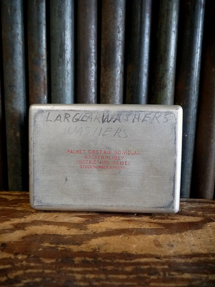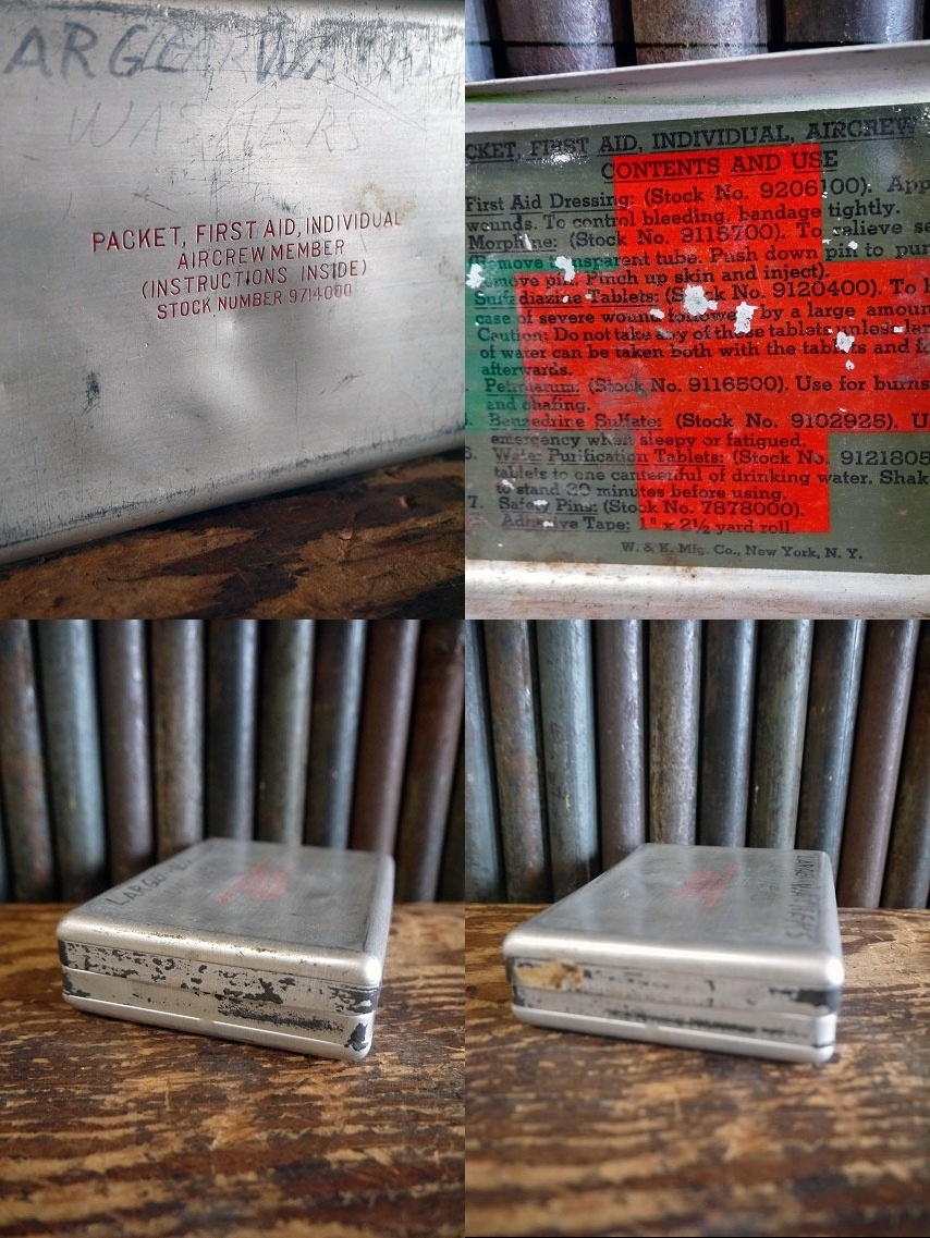 アメリカで買い付けましたビンテージのPACKET FIRST AIDメタルケースです。使い込まれたリアルなメタル風合い&にロゴ&裏面デカールデザインがとても雰囲気があります。アメリカのWWIIにて飛行機パイロットが携帯していたアルミ製の簡易用救急箱で、年代の表記はありませんがデザインから1940年中期頃かと思います。コレクション兼ディスプレイとしご使用下さい。状態ですが経年による多少の傷、凹みや歪み、ペーパー汚れや内側デカールの剥がれ、マジックネーム描きや汚れはありますが、実用ディスプレイにも問題ない状態です。あくまでビンテージになりますのでご理解いただける方のご購入をよろしくお願いします。