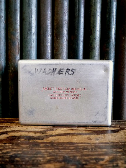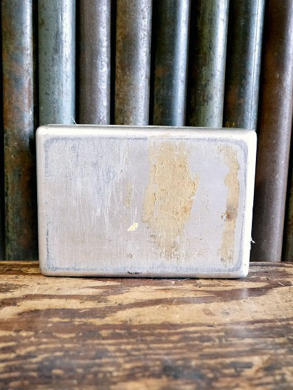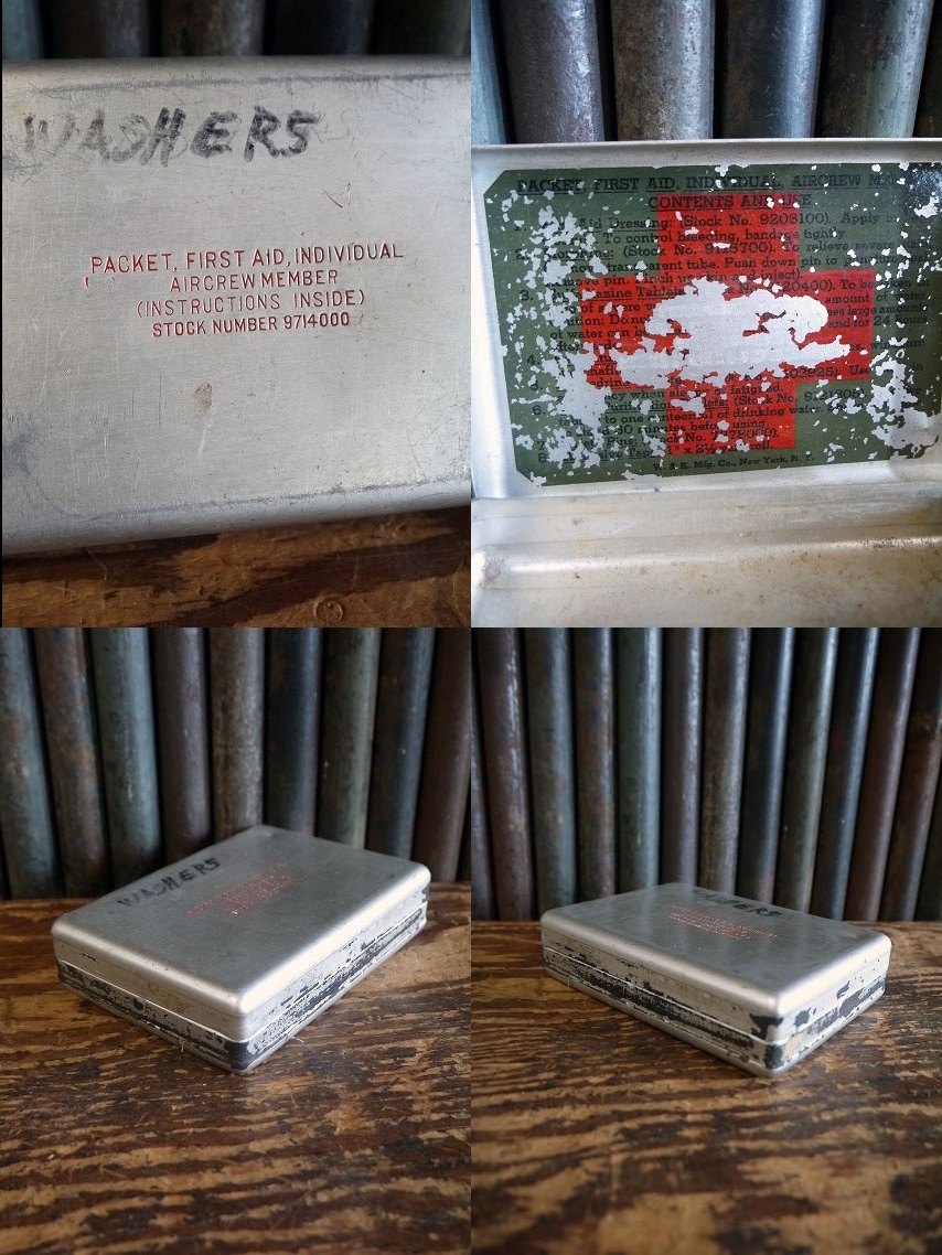アメリカで買い付けましたビンテージのPACKET FIRST AIDメタルケースです。使い込まれたリアルなメタル風合い&にロゴ&裏面デカールデザインがとても雰囲気があります。アメリカのWWIIにて飛行機パイロットが携帯していたアルミ製の簡易用救急箱で、年代の表記はありませんがデザインから1940年中期頃かと思います。コレクション兼ディスプレイとしご使用下さい。状態ですが経年による多少の傷、凹みや歪み、ペーパー汚れや内側デカールの剥がれやマジック汚れはありますが、実用ディスプレイにも問題ない状態です。あくまでビンテージになりますのでご理解いただける方のご購入をよろしくお願いします。