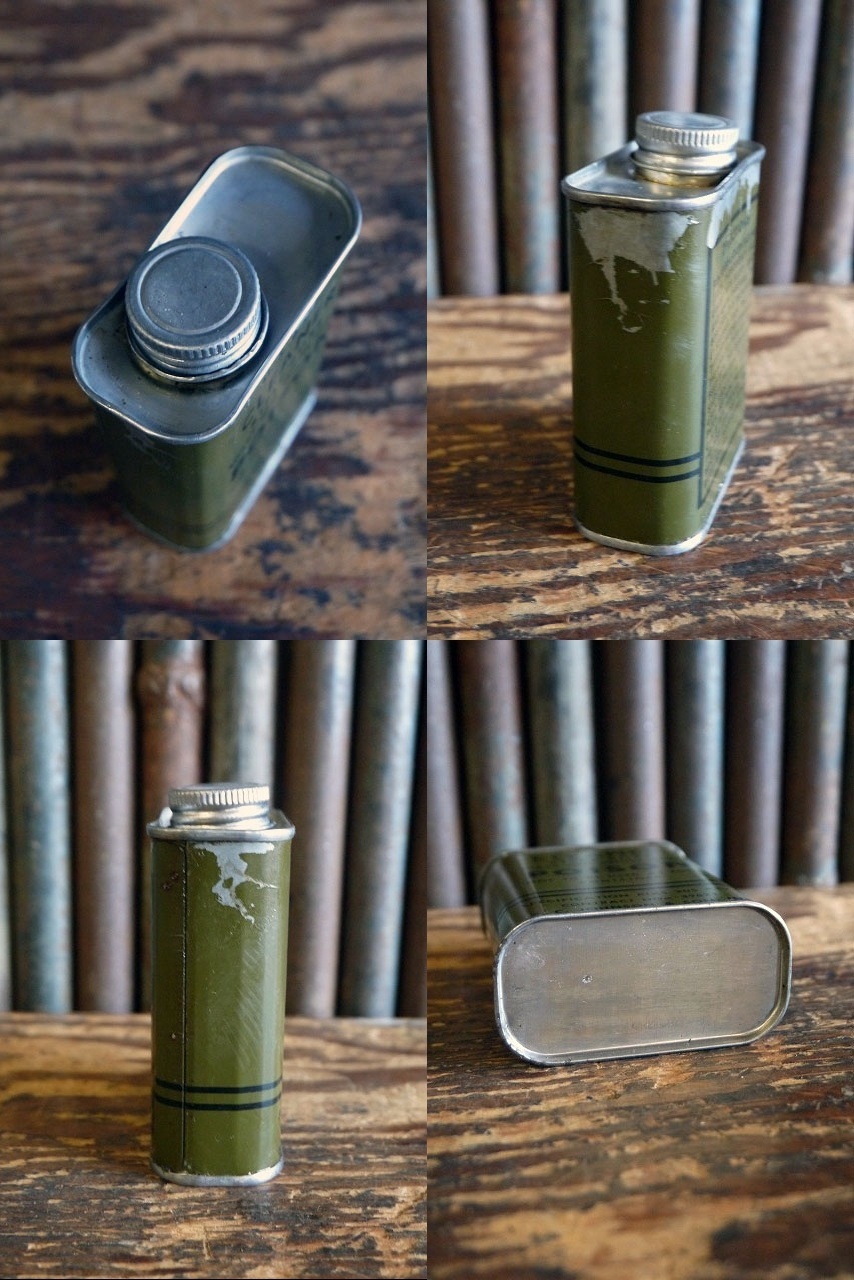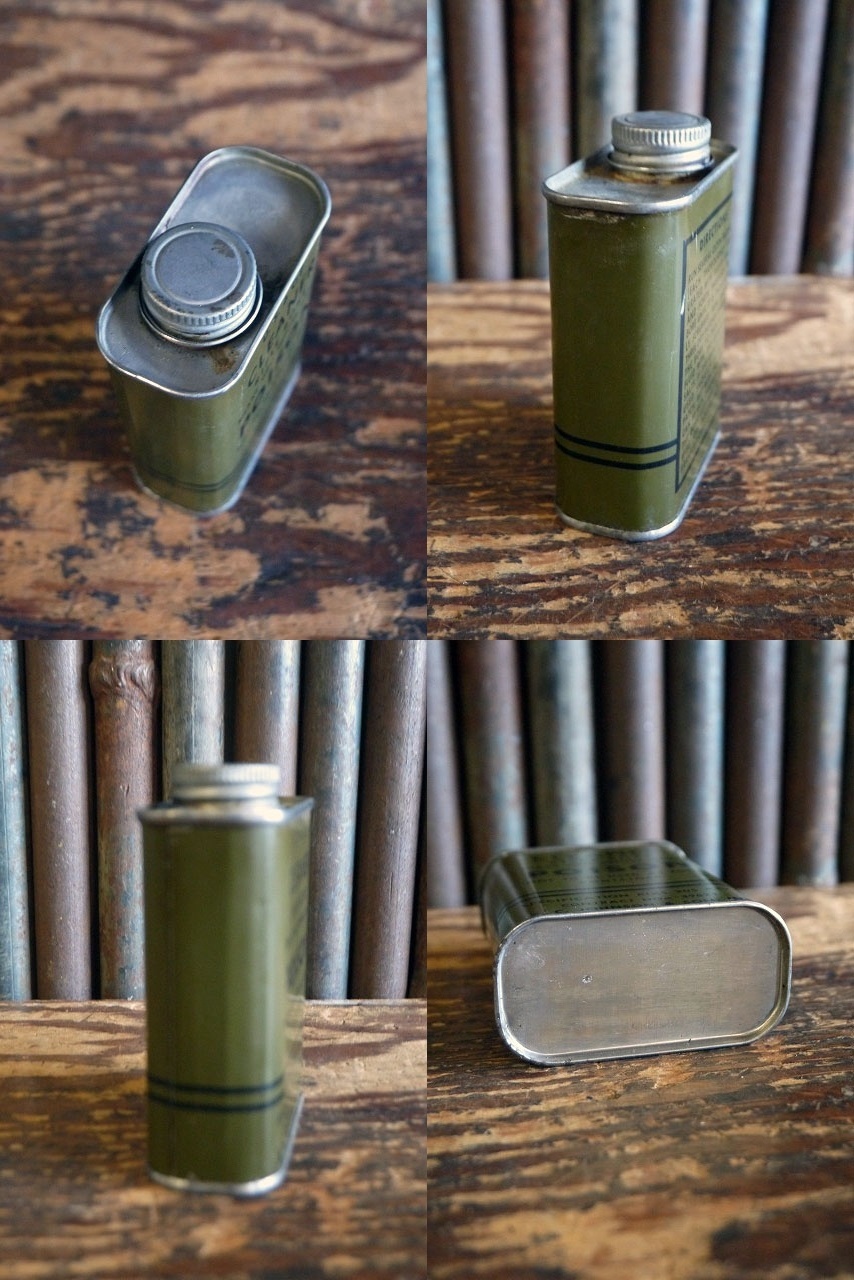 アメリカで買い付けましたビンテージのD.Stock U.S CLEANER缶です。ミリタリーグリーンカラーにシンプルなロゴデザインがとても雰囲気があります。アメリカのU.Sアーミーが第二次世界大戦頃に使用していた銃口のメンテナンス剤で、年代の表記はありませんがデザインから1940年代中期頃になります。未開封で中身は入っています。コレクション兼ディスプレイとしておすすめです。状態ですが経年経過による小傷、擦れ、サビ汚れ画像の様な塗装剥がれや多少匂いや上蓋キャッブの錆びつき等ありますが、ガレージのディスプレイには問題ない程度です。締め切ったお部屋ではなくガレージや通気性のあるガレージでディスプレイして下さい。ただあくまでビンテージになりますので理解のある方のご購入をお願いします。