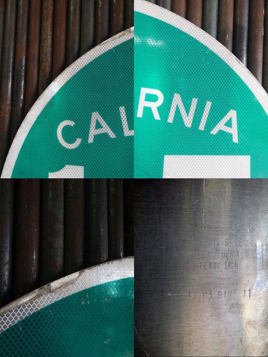 アメリカにて買い付けましたUSAのCALIFORNIA 125ロードサインです。グリーン×ホワイトカラーに3桁のナンバーがとても雰囲気があります。スチールアルミ素材のプリントデカール(ハニカム&ボーダー使用)の反射板タイプ裏側の刻印から2017年6月製になります。ガレージやお店のディスプレイとしておすすめです。状態ですが多少の傷、汚れ、画像の様に表面ビニールの剥がれた部分などはございますが、ディスプレイには問題ない状態です。あくまでユーズドジャンクですのでご理解いただける方の購入をよろしくお願いします。
