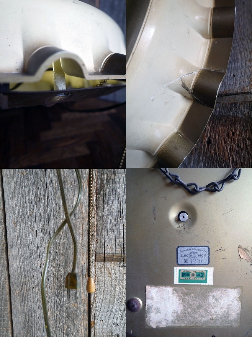 アメリカで買付けましたビンテージの OLYMPIA Light BEERライトサインクロックです。アメリカのアルコールビールメーカーの販促用ライトサインで、淡いカラーリング&ボトルキャップデザインがカッコイイです。画像の様に明かりと付けると綺麗でお店等のディスプレイとして最適です。プラスチック×裏面メタル素材で年代の表記はありませんがデザインから1970年代になるかと思います。コンセントは通常タイプで、コンセンブラグを差すと時計が動き、下側部分のボールチェーンを引っ張ると照明部分がON/OFFに切り替わります。内側には細長い小さ目の蛍光灯が付属しますが、切れた場合にはご用意下さい。(海外企画で日本で販売されていない場合もございます。切れた場合にはご用意ください。)今の所は照明部分の点灯や時計部分のもほぼ時差なく動きます。コレクション兼ディスプレイ用の照明看板としてお使い下さい。状態ですが画像の様に擦れ、汚れ、塗装剥がれ、画像の様に割れ補修、フロント部分内側のくすみ、裏面の4か所あるネジの2か所が交換とネジの細いブラスチック部分は劣化して割れ&ボンド補修がありますのでこの部分のネジは固定させていて取り外せません(裏面のメタル板は3か所オリジナルのつまみを回すと外れますので、蛍光灯部分が切れた場合には交換可能です。)等はありますが、ディスプレイには問題ない雰囲気のある状態です。状態を考慮していますのでお探しの方はご検討下さい。ただあくまでビンテージになりますのでご理解のある方のご購入をお願いします。0HZ仕様になりますので東日本のお住まいでしたらこのままでご使用すると不具合が起こる可能性もございますので変圧器が必要かと思います。ただあくまでビンテージになりますのでご理解いただける方の購入をお願いします。