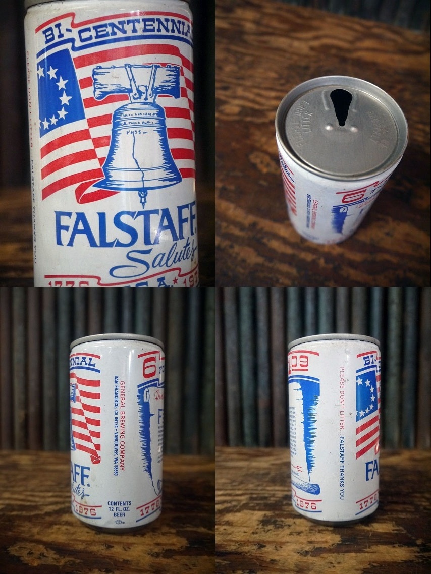 アメリカで買い付けましたビンテージのFALSTAFF BEER缶です。人気ドリンクメーカーの空缶で、リアルなメタルの風合い&お馴染みのブランドロゴデザインがとても雰囲気あるアイテムです。軽いアスチールメタル素材でガーデニングやお部屋のディスプレイとしておすすめです。こちらは建国200周年記念で発売された1976年の記念モデルになります。状態は経年による小傷、金属劣化による多少の凹み、多少のサビ汚れやブルタブの欠損等はありますが特に目立つ様なダメージも無くディスプレイには問題ない雰囲気のある状態です。あくまでビンテージジャンクですのでご理解いただける方のご購入をよろしくお願いします。