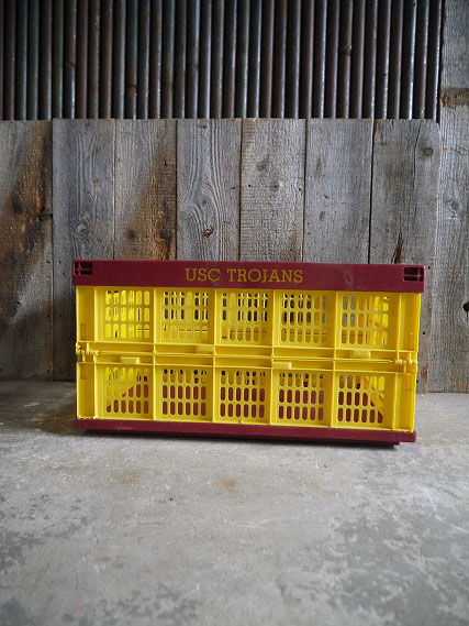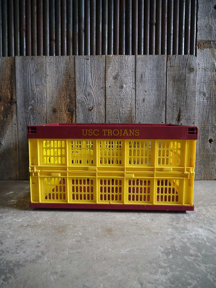 アメリカで買い付けましたビンテージのUSC TROJANSケースです。イエロー×バーガンディーカラーに使い込まれたリアルな風合い&シンプルなデザインもとても雰囲気があります。アメリカのカリフォルニア州ロサンゼルスにある南カリフォルニア大学(略称: USC)の学生スポーツチームのロゴの入った運搬用ケースで、軽めのプラスチック素材の作りになります。画像の様に簡単に折り畳めて収納にも便利です。年代の表記はありませんがデザインから1990年代頃かと思われます。状態ですが経年による多少の色褪せ、画像の様に多少の湾曲や汚れ等はありますが、目立つ割れやビンテージの雰囲気を損なうようなダメージはなく、実用ディスプレイ等には問題ない程度です。ただあくまでビンテージになりますのでご理解いただける方のご購入をよろしくお願いします。