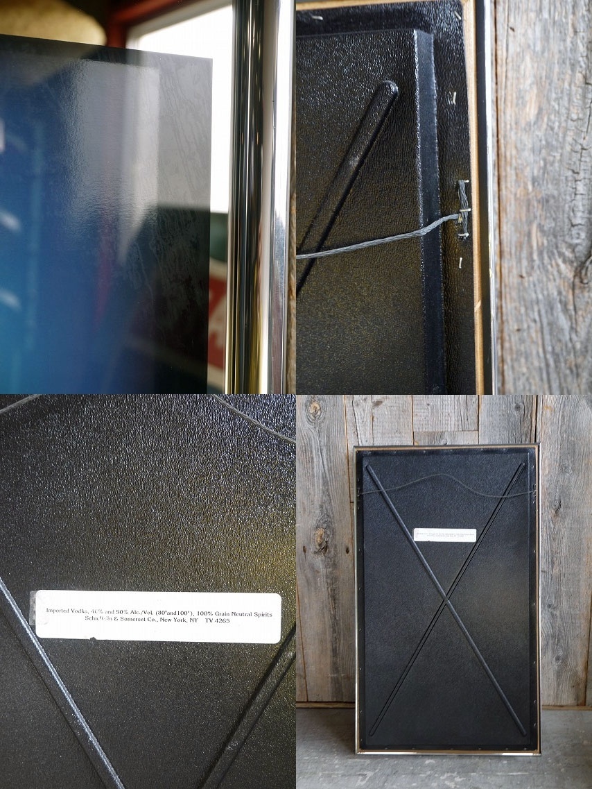 アメリカにて買い付けましたビンテージのTanqueray Sterling VODKAパブミラーです。イングランドのアルコールメーカーのパブミラーで、渋いメタル(内側ウッド)フレームにおしゃれなデザイン画がとても雰囲気があります。ウッド(シルバーラインがプラスチック)×ガラス素材で、奥行きのあるデザインでボトル部分はペーパー画になります。年代の表記はありませんがデザインから1990年前後頃になるかと思います。お部屋からショップのディスプレイまで幅広くおすすめです。中央のデザイン画はペーパーになります。状態ですが経年によるフレームに傷や画像の様なカケ、多少のミラーのくすみや内側に汚れ、擦れなどはありますが、ディスプレイには問題ない雰囲気のある状態で良いです。ただあくまでビンテージのためご理解いただける方のご購入をお願いします。