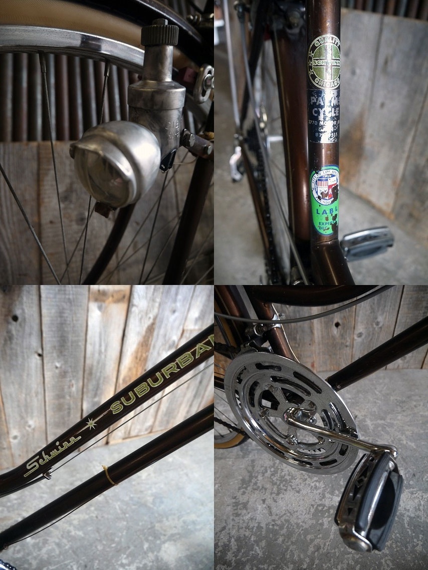 アメリカで買い付けたビンテージSCHWINN-SUBURBAN自転車です。綺麗なブラウンカラーに使い込まれた風合い&お馴染みのエンブレムロゴデザインが大変雰囲気のあるアイテムです。アメリカのシカゴにて1895年に創業した人気の自転車メーカーの自転車で、両タイヤ&チューブ(BRIGESTONE社製)、ブレーキシュー、ブレーキパット等日本規格の新品に交換済みで実際に乗れるようにメンテナンス済みになります。(公道で乗る場合には防犯登録、ライトが必要になります。)実用兼店舗等のディスプレイ什器としてもオススメです。年代の表記はありませんがデザインから1970年代になります。前後ライトは現状では点灯しませんので、別途ライトが必要になります。状態ですが経年による使用感で画像の様にハンドルフレーム付近等に傷、擦れ、サビや塗装剥がれ等はございますが、ライト以外は実用可能なメンテナンス済みで、ディスプレイには問題ない状態で良いです。ただあくまでビンテージですのでご理解いただける方のご購入をよろしくお願いします。