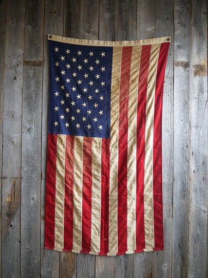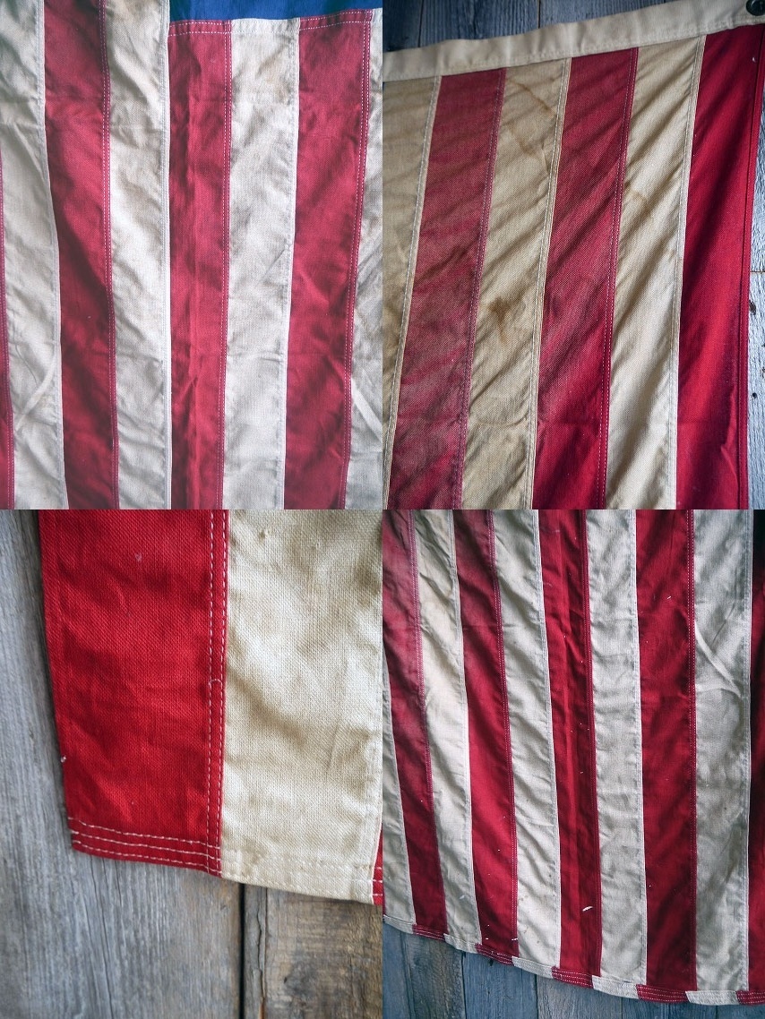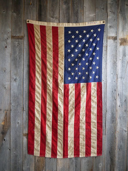 アメリカで買い付けたビンテージのD.STOCKのUSA星条旗です。STARS&STRIPISのデザインは定番ながら抜群カッコよさがあり、雰囲気を求められるショップ等にはディスプレイとして最適かと思います。 1960年7月4日から現在迄使われている定番50スターデザインでビンテージならではの生地感とフェード具合が抜群の雰囲気です。素材は100%コットン素材で、スター部分は刺繍デザイン、年代の表記はありませんが会座インから1970年代初期頃になります。状態は経年による折りたたみシワ、汚れやフェードはありますが、穴などの目立つダメージもなく、全体的にはディスプレイに問題ない雰囲気のある状態です。あくまでビンテージですのでご理解いただける方のご購入をよろしくお願いします。