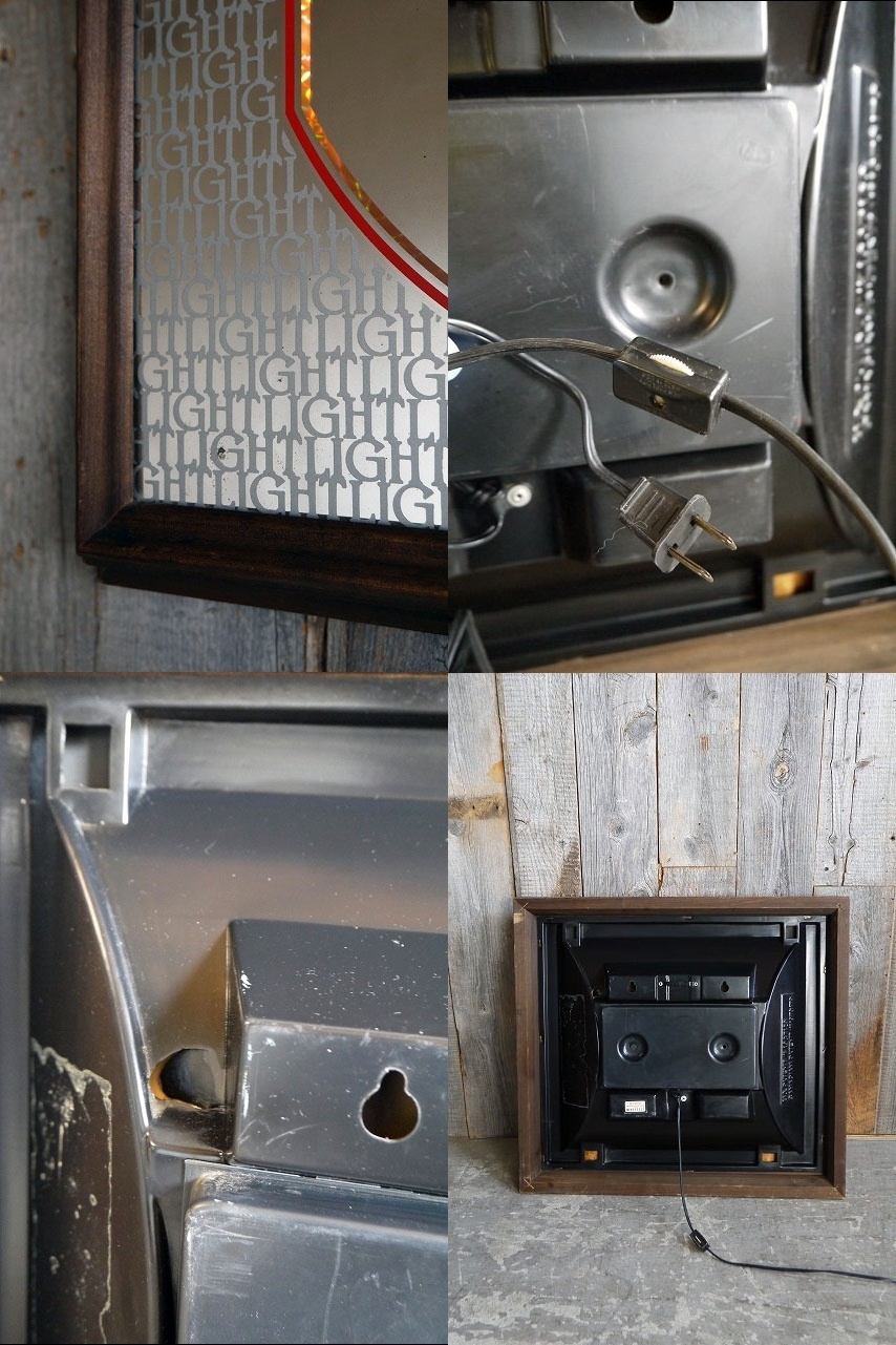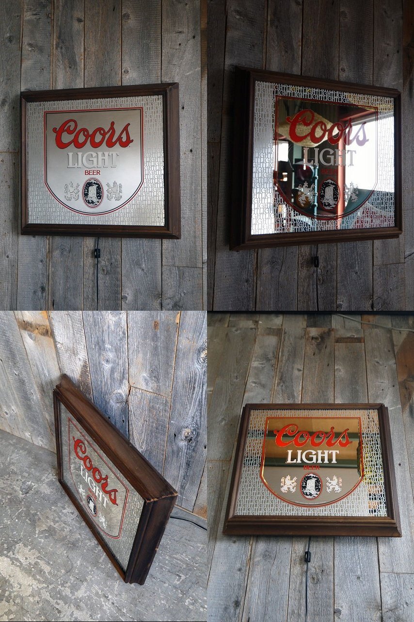 アメリカで買付けましたビンテージのCoors LIGHT BEERライトサインです。渋いウッドフレームにOILアメリカンなオシャレなデザインで、明かりを付けると非常に綺麗でとても雰囲気があります。人気ビールメーカーの販促用で実際にSHOP等で使用されていたものになります。壁付けタイプで、オリジナルのコンセントコート&切り替えスイッチ式ですぐにご使用頂けます。内部にはE-12口径の電球が4個ついていますので電球が切れた場合はご用意下さい。ウッドフレームに表面ガラスで、裏面はプラスチック素材になります。フロント左下に1980のコピーライト表記がありますので1980年〜80年代初期頃になります。状態ですが多少の小傷、ガラス内側の汚れ、擦れ、塗装剥がれ、コード劣化や裏面カケ穴、片側の金具ツマミの欠損などはありますが目立たない程度で、今の所点灯動作確認済みでディスプレイには問題ない状態です。 ただあくまでビンテージですので理解のある方のご購入をお願いします。
