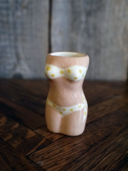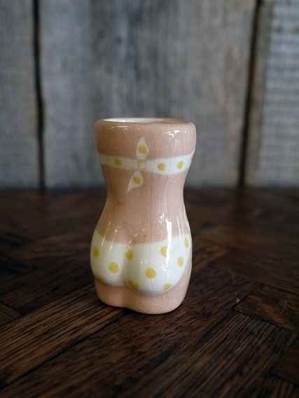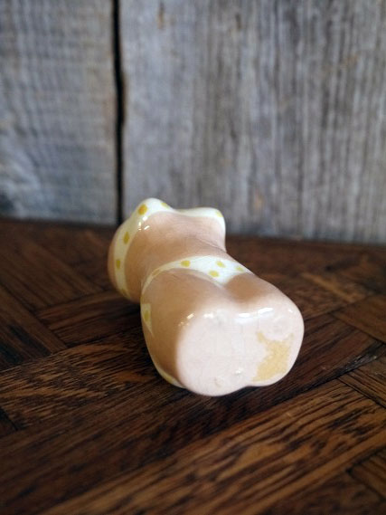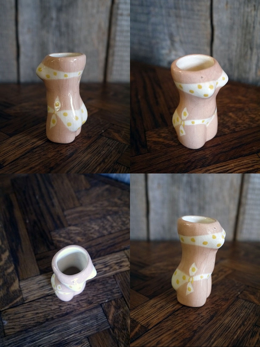 アメリカで買い付けましたビンテージのミニオブジェです。スキンカラーに可愛らしい水玉ビキニデザインでとても雰囲気があります。陶器素材で刻印はありませんが、デザインから1950〜60年前後頃になるかと思います。状態は多少の薄い汚れ、画像の様に経年経過や生産工程上に出来たと思われる表面のひび割れ多少の薄い汚れはありますが、目立つ感じではなく、ディスプレイには問題の無い状態です。ただあくまでビンテージですのでご理解いただける方の購入をよろしくお願いします。