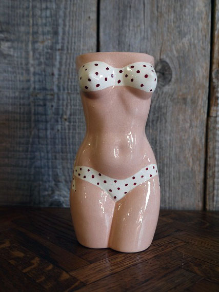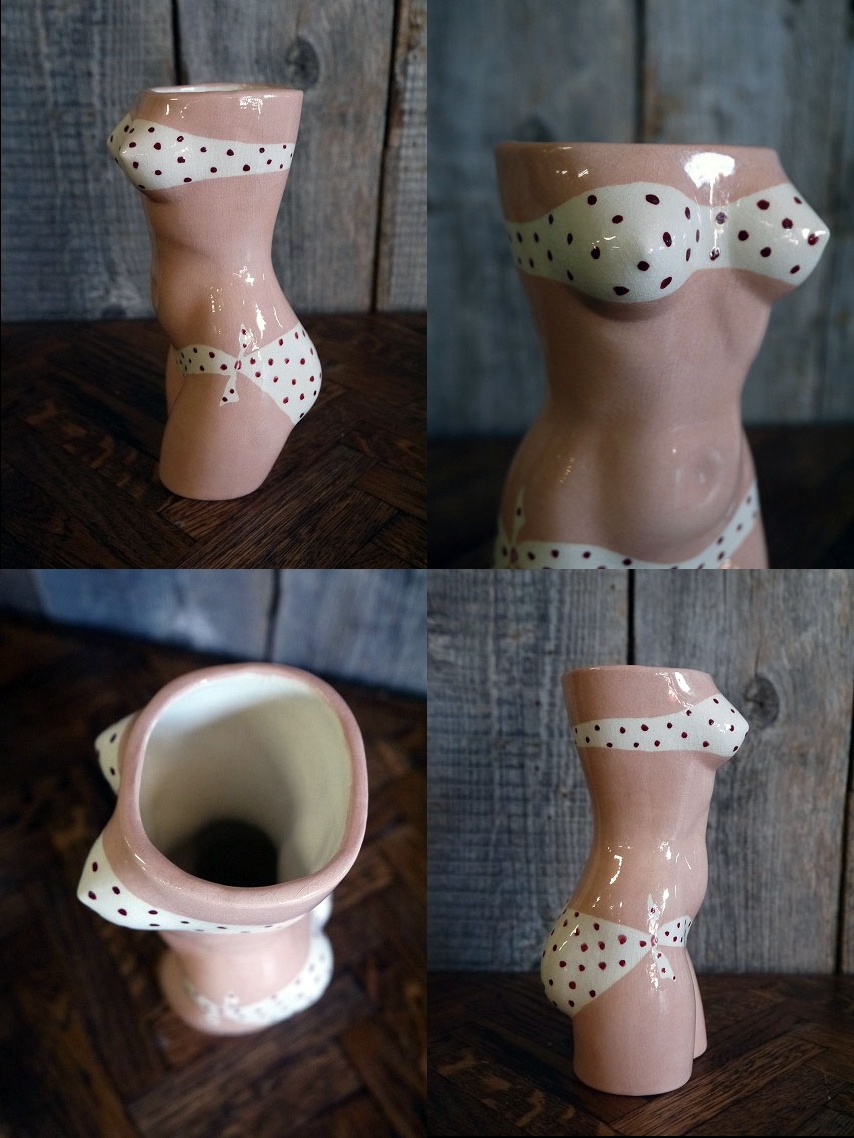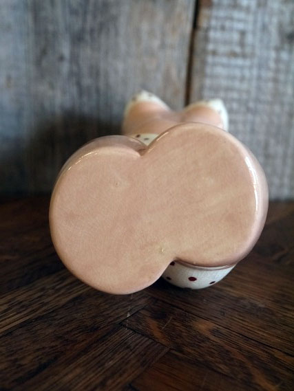 アメリカで買い付けましたビンテージのミニオブジェです。スキンカラーに可愛らしい水玉ビキニデザインでとても雰囲気があります。陶器素材で刻印はありませんが、デザインから1950〜60年前後頃になるかと思います。状態は多少の薄い汚れ、画像の様に経年経過や生産工程上に出来たと思われる表面のひび割れ多少の薄い汚れはありますが、目立つ感じではなく、ディスプレイには問題の無い状態です。ただあくまでビンテージですのでご理解いただける方の購入をよろしくお願いします。
