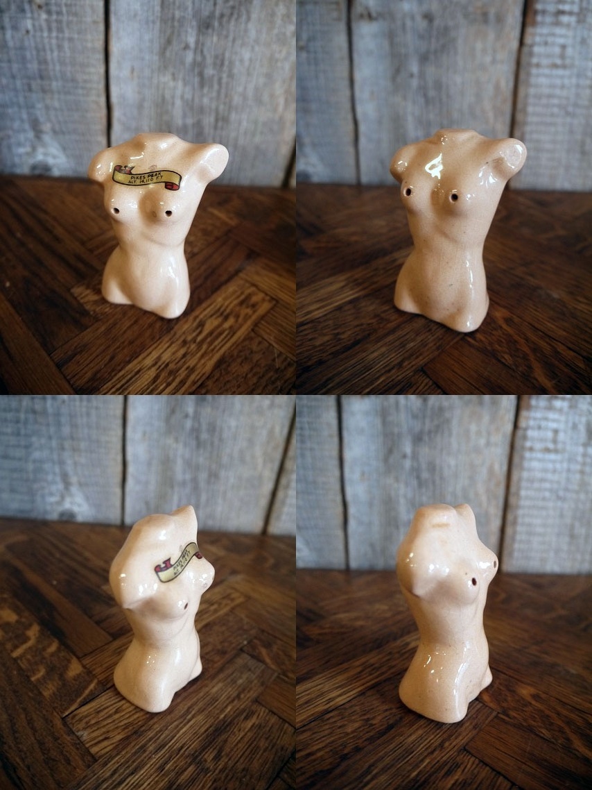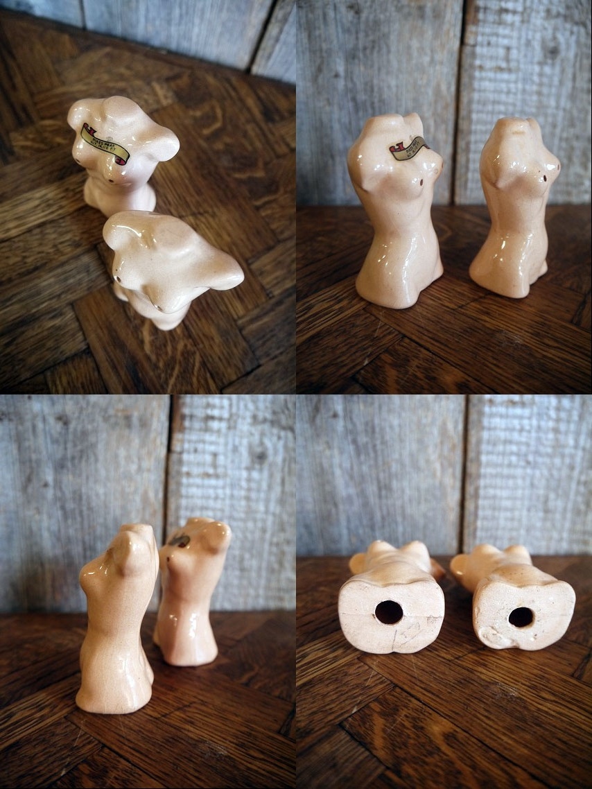 アメリカで買い付けましたビンテージのSALT&PEPEER セットです。スキンカラーに珍しいトルソーデザインでとても雰囲気があります。陶器素材で刻印はありませんが、デザインから1950年代頃になるかと思います。状態は多少の薄い汚れ、画像の様に経年経過や生産工程上に出来たと思われる表面のひび割れ多少の薄い汚れ、胸元デカールに細かい剥がれ、恐らく底面にあったと思われるキャップの欠損はありますが、目立つ感じではなく、ディスプレイには問題の無い状態です。ただあくまでビンテージですのでご理解いただける方の購入をよろしくお願いします。