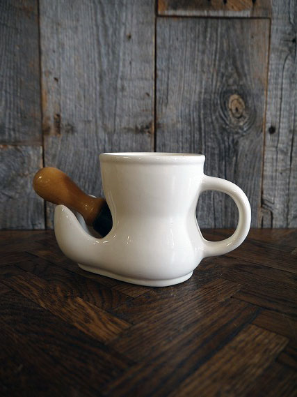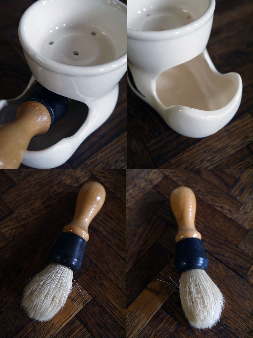 アメリカで買い付けましたビンテージのSHAVING MAGです。ミルクカラーに髭デザインがとても雰囲気があります。陶器素材で底面の表記はありませんがデザインから1960〜70年代頃になるかと思います。状態は画像の様に経年経過や底面等に多少の汚れ、毛先の抜けはありますが、目立つダメージは無く、ディスプレイには問題の無い状態で良いです。ただあくまでビンテージですのでご理解いただける方の購入をよろしくお願いします。