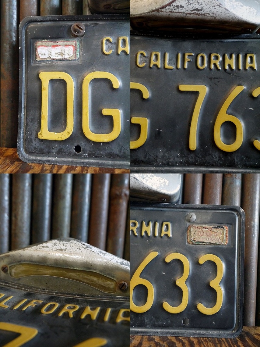 アメリカにて買い付けしましたビンテージCALIFORNIAナンバープレートです。アメリカカリフォルニア州の車に実際に取り付けられて使用していたもので、リアルな傷や汚れがかなり雰囲気があります。メタル素材で、1963年〜1969年迄採用されていたブラック×イエローカラーデザインになります。裏面の刻印から1963年になります。ナンバープレートの上側にはアルミ製のランプパーツが付属していますが、表面のプラスチックには劣化はありますので実用は難しいかと思います。状態ですが多少の擦れ、錆び汚れ、塗装剥がれ、プレートに歪みや凹み、片側ネジの交換、劣化、ラバーの劣化等はありますが、ディスプレイには問題ない雰囲気のある状態です。ただあくまでビンテージですのでご理解いただける方のご購入をよろしくお願いします。