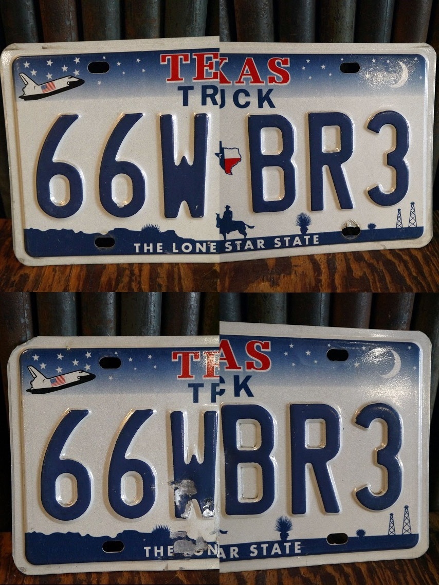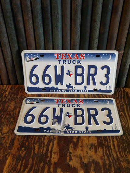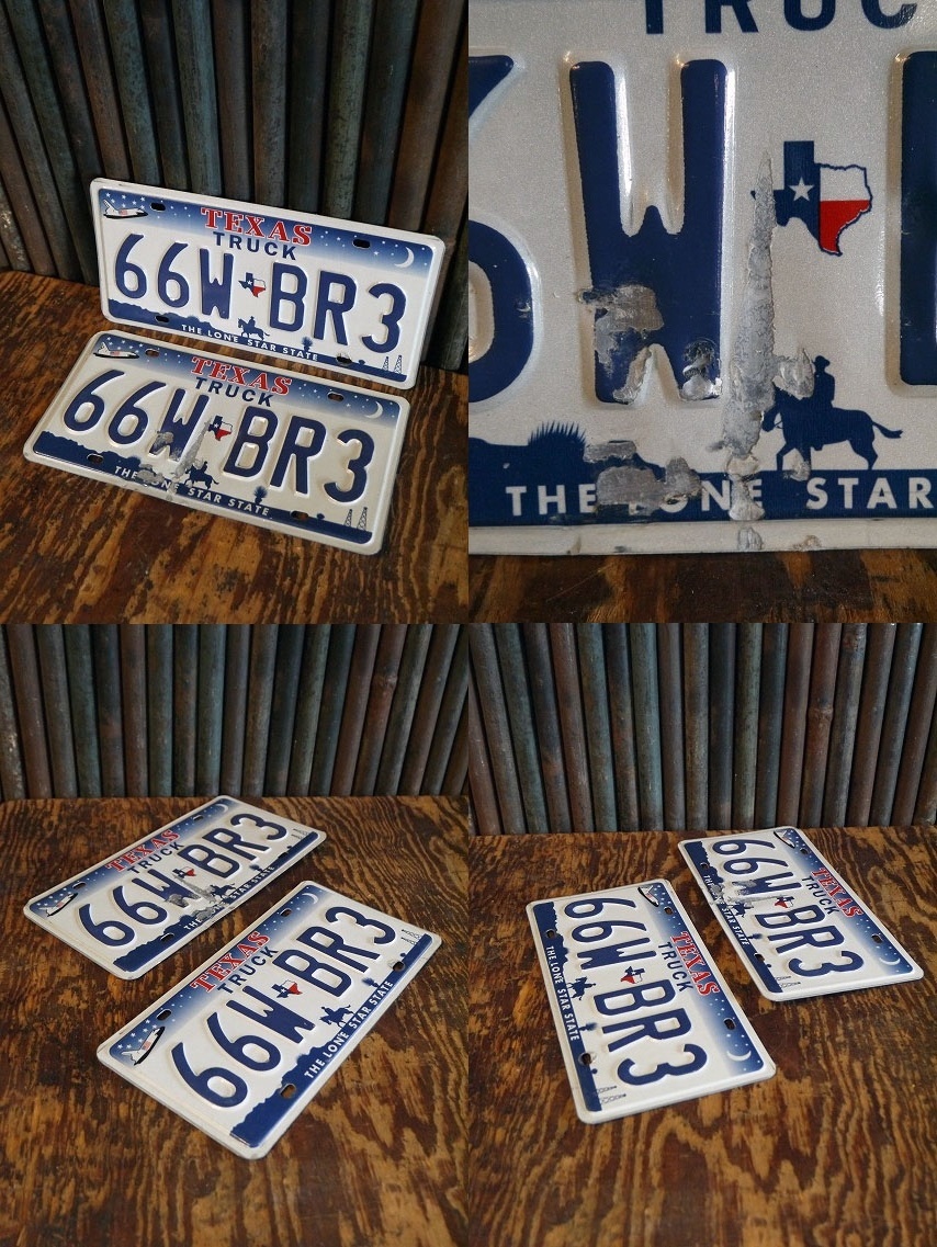 アメリカにて買い付けしましたUSA TEXAS TRUCKナンバープレーセットです。アメリカテキサス州の車(トラック)に取り付けられて使用されるナンバープレートで、リアルなメタルの風合いが雰囲気あります。軽いスチールアルミ素材で、2005年10月〜2009年6月迄採用されていた人気のサンシャインデザインになります。状態ですが、多少の擦れ、傷はありますが、使用感もほとんどなく、ディスプレイには問題ない雰囲気のある状態で良いです。ただあくまでビンテージですのでご理解いただける方のご購入をよろしくお願いします。