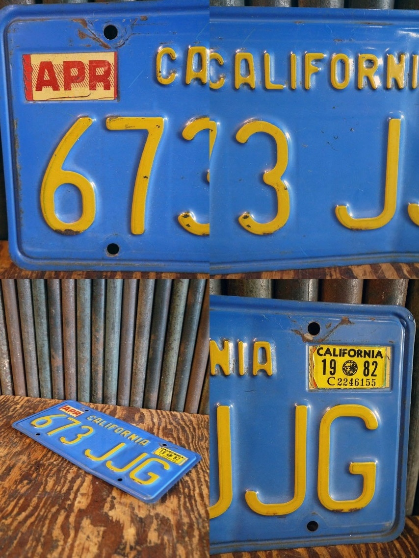 アメリカにて買い付けしましたビンテージCALIFORNIAナンバープレートです。アメリカカリフォルニア州の車に実際に取り付けられて使用していたもので、リアルな傷や汚れがかなり雰囲気があります。 1969年から1981年迄採用されていたブルー×イエローのカラーデザインで、軽いスチールアルミ素材で、1970年代後期〜1980年代初期頃になります。状態ですが多少の擦れ、錆び汚れ、塗装剥がれ、プレートの歪みや凹みはありますが、ディスプレイには問題ない雰囲気のある状態です。ただあくまでビンテージですのでご理解いただける方のご購入をよろしくお願いします。