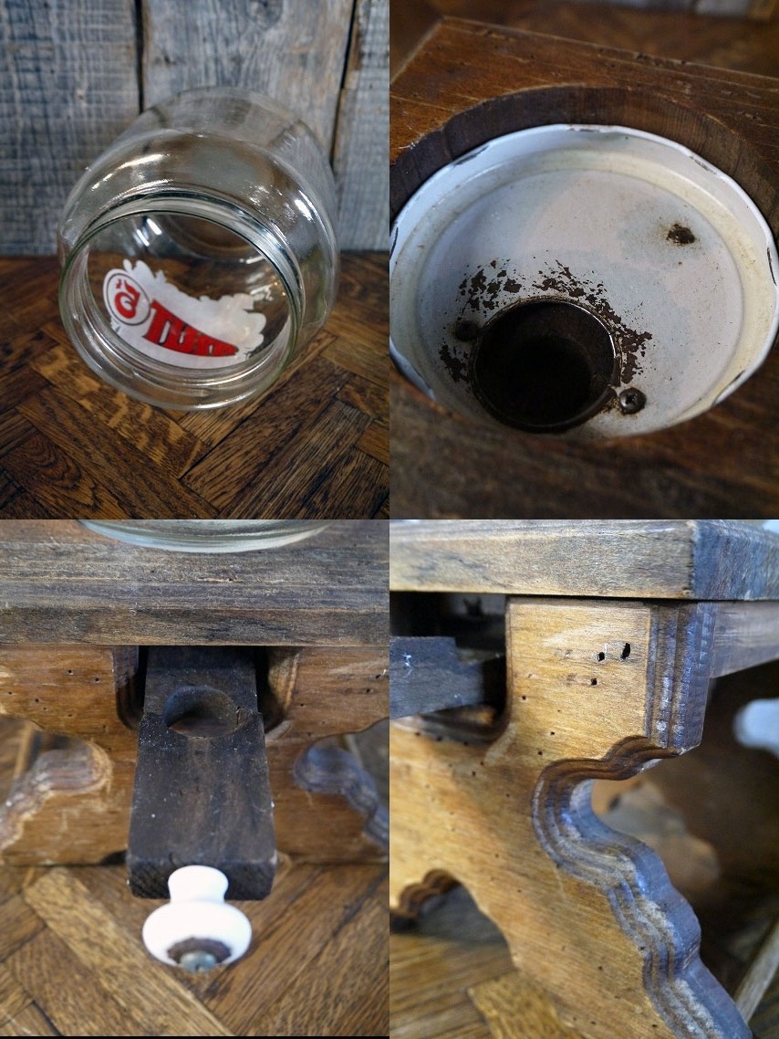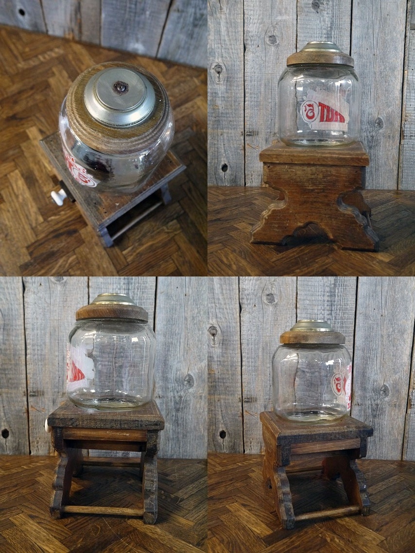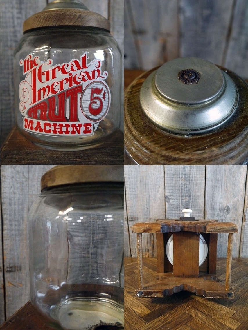 アメリカで買い付けてきましたビンテージのNUTSディスペンサーです。アメリカンなデザインとウッドの風合いがとても雰囲気があります。ウッドスタンドタイプで、下側の取っ手を引くと中身が出てきます。厚めのガラス瓶で、瓶を回すとスタンドから取り外せます。古いものになりますので、お店のディスプレイとしてオススメです。上蓋部分の接着は劣化してほとんどは外れて欠損していますがこちらも付属しています。年代の表記はありませんがデザインから1970年代〜80年前後頃になります。状態ですが、経年経過による多少の使用感で擦れ、ペイントロス、ウッド部分に汚れや傷、画像ではわかりにくいのですですがガラス部分に生産工程上に出来た多少の凹凸、金属部分に多少のサビはありますが、目立つ様なダメージも無くディスプレイには問題ない状態です。ただあくまでビンテージですのでご理解いただける方のご購入をよろしくお願いします