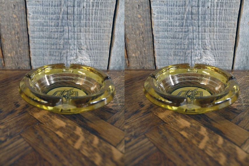 アメリカで買い付けましたビンテージのAMERICA₋WESTガラス灰皿です。淡いアンバーガラスにアメリカンなロゴデザインが非常に良い雰囲気です。アメリカの国内にて1981年2月に設立された航空会社で2007年にはUS AIRWAYSに統合されて今は無き空港会社のノベルティになります。表記はありませんが年代的には1980年代初期頃になります。状態ですが、多少の擦れやわずかな潤井汚れはありますがディスプレイに問題ないレベルで良いです。(灰皿として実用の場合には古い商品になりますので熱によりヒビの部分が割れる可能性もございますのでご注意ください。)ただあくまでもビンテージになりますのでご理解いただける方のご購入をお願いします。