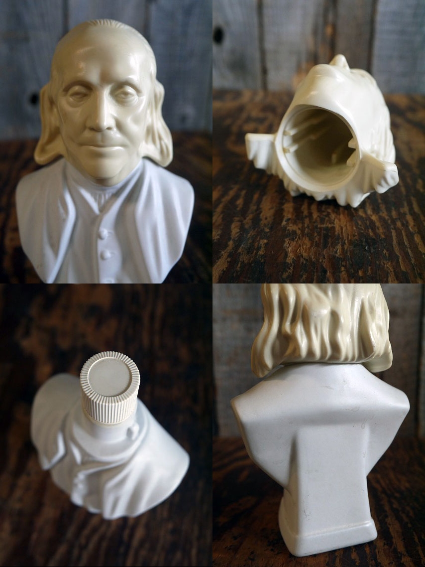 アメリカで買い付けたビンテージのオブジェです。アメリカの100$紙幣のデザインになっているのBenjamin Franklinの胸像デザインになります。頭部はプラスチック、ボディはガラス素材で、年代の表記はありませんがデザインから1980年代頃になります。お部屋等のコレクション検ディスプレイとしておすすめです。状態は多少の擦れ、汚れや多少の硬化などはありますが、ディスプレイには問題ない状態です。あくまでビンテージジャンクですのでご理解いただける方のご購入をよろしくお願いします。