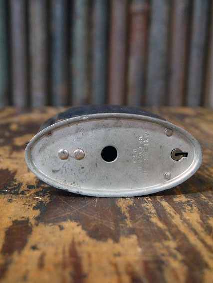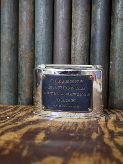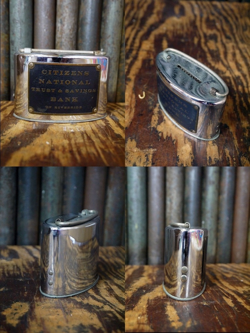 アメリカで買い付けましたアンティークのCITIZENS NATIONAL TRUST&SAVINGS BANK 貯金箱です。経年によるメタルの風合いも良く重厚感がありカッコイイです。アメリカカルフォルニア州リバーサイドにて1907年に設立された銀行の貯金箱になります。コレクターの方はもちろんのことディスプレイとしてお部屋からショップまで幅広くおすすめです。鍵は欠損していますので底蓋は開きません。年代の表記hありませんがデザインから1930〜40年代頃かと思います。状態ですが、経年による金属劣化や錆、上側に凹みや傷や擦れ、サビ汚れや鍵欠損といった使用感はございますがディスプレイとして雰囲気を損なうようなダメージはなくアンティークならではの状態かと思います。あくまでアンティークになりますのでご理解いただける方のご購入をよろしくお願い致します。