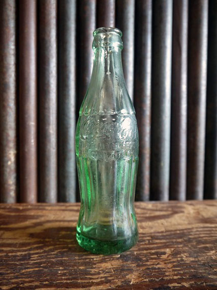 アメリカで買い付けましたビンテージのCoca-Colaボトル瓶です。アメリカのドリンクメーカーの古いボトル瓶で、グリーンガラス&アメリカンなロゴデザインがとても雰囲気があります。ガラス素材で底面からネバダ州ラスベガスの工場にて作られた瓶で、パテントNOから1939年8月〜50年初期頃のデザイン、側面に読み取りにくいのですがかすかに頭文字4の文字が確認できますので40年代後期頃かと思います。状態ですが多少の傷、擦れ、細かいチップ、内側に多少の汚れはありますが、割れなどの目立つダメージはなくディスプレイには問題の無い雰囲気のある状態で良いです。ただあくまでビンテージですのでご理解いただける方の購入をよろしくお願いします。