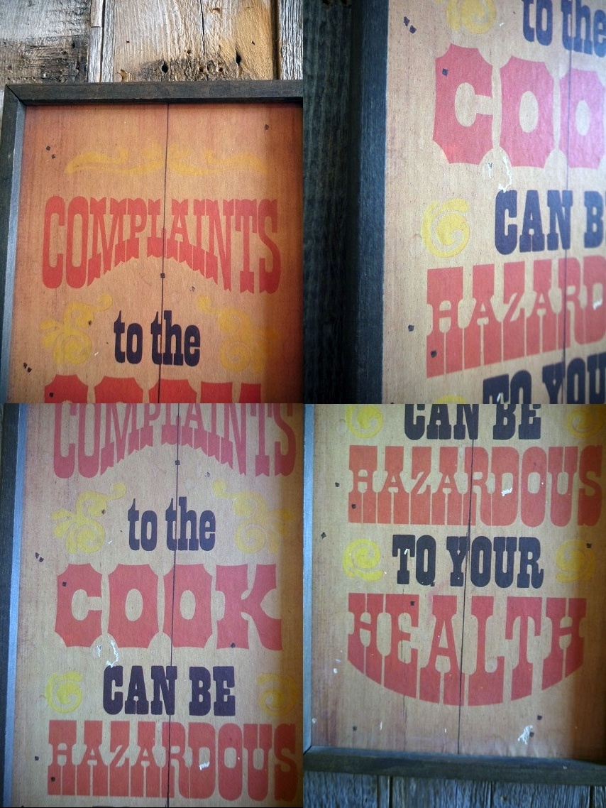 アメリカにて買い付けましたビンテージのCOMPLAINSサインです。経年によるウッドの風合いとアメリカンなロゴデザインがとても雰囲気があります。表面はペイント風ペーパーデザイン×軽いウッドフレームの壁掛けタイプで、お部屋からショップのディスプレイまで幅広くおすすめです。下側角に1973のコピーライト表記はありますので1973年〜70年代になります。状態ですが表面ペーパー部分に画像の様多少の剥がれや湾曲、フレームに隙間や多少の歪み、カケや裏側壁掛け金具の取り付け等はありますが、ディスプレイには問題ない雰囲気のある状態です。あくまでビンテージですのでご理解いただける方の購入をよろしくお願いします。