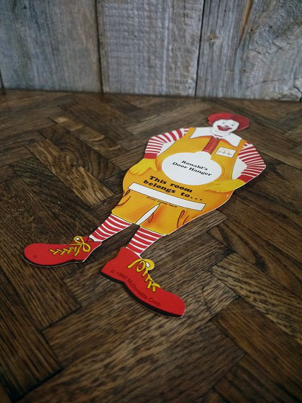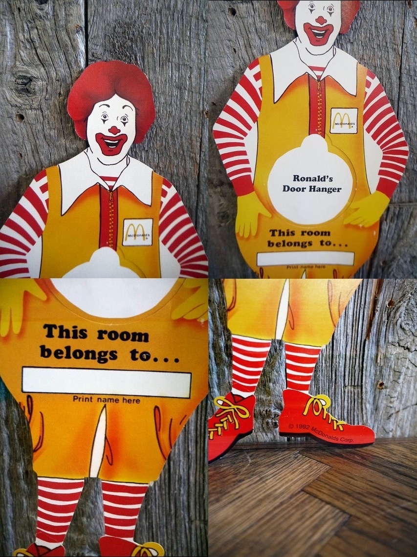 アメリカで買い付けましたビンテージのRONALD MACDONALDドアプレートです。アメリカンで可愛らしいデザインがとても雰囲気があります。ペーパー素材で、1992のコピーライト表記がありますので1992年〜90年代中期頃になります。状態ですが未使用ですが、経年経過により。多少の擦れ、細かいシワ、薄い汚れや裏面にシール貼りなどはありますが、ディスプレイには問題の無い状態で良いです。ただあくまでビンテージですのでご理解いただける方の購入をよろしくお願いします。