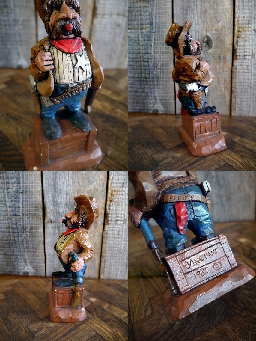 アメリカで買い付けましたビンテージのSHELIFFオブジェです。ユーモアのある特徴的な顔の表情やハンドペイントの温もりのあるカラーリングがとても雰囲気があります。石膏素材になります。裏側に1980のコピーライト表記がありますので1980年代初頭になります。お部屋のインテリアからショップ等のディスプレイまで幅広くおすすめです。状態ですが経年による多少の小傷、擦れ、細かい塗装剥がれや汚れ等はありますが、ディスプレイとしては問題ない雰囲気のある状態でよいです。ただあくまでビンテージになりますのでご理解いただける方のご購入をお願いします。