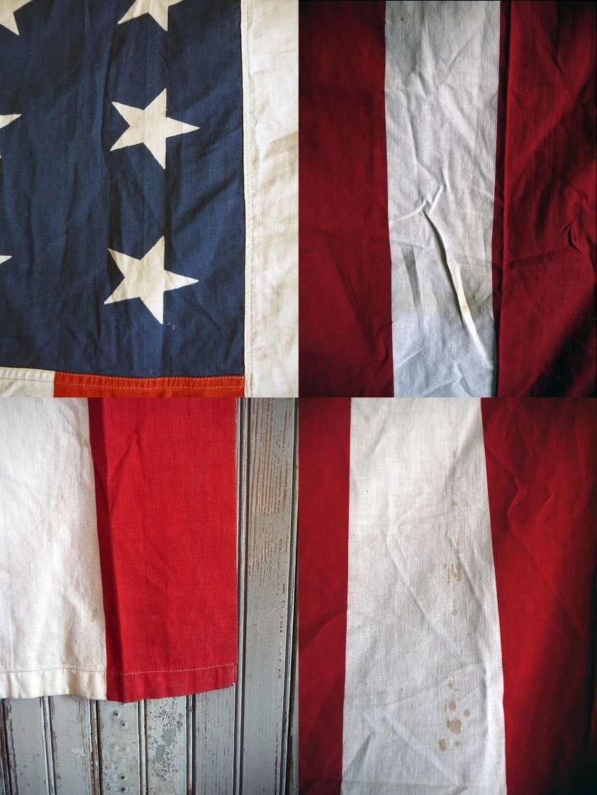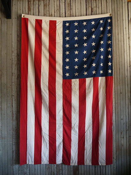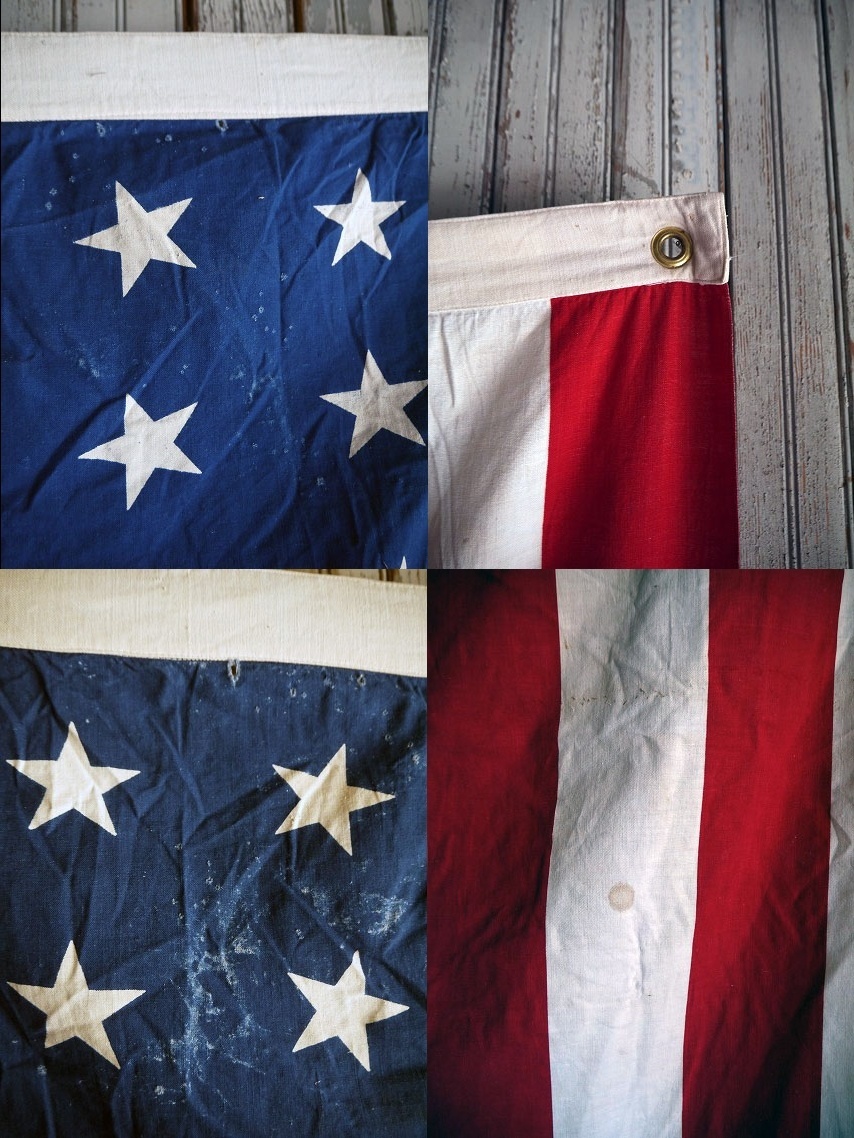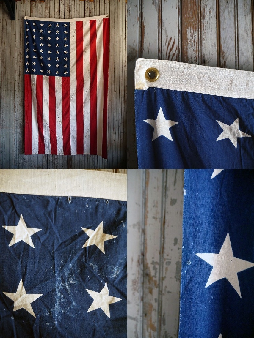 アメリカで買い付けたビンテージのUSA 48S STAR 大型星条旗です。STARS&STRIPISのデザインは定番ながら抜群カッコよさがあり、雰囲気を求められるショップ等にはディスプレイとして最適かと思います。 1912年7月4日から1959年7月3日迄使われていた48スターデザインで、ビンテージならではの生地感と雰囲気です。素材は100%コットン素材、USA製、染み込みで表記はありませんが、恐らく1940年代後期〜50年代初期頃になるかと思います。状態は経年による折りたたみシワはや画像の様な細かいホールや生地の擦れはありますがビンテージの雰囲気を損なうような目立つダメージもなく、色合いの&生地感も最高で、全体的にはディスプレイに問題ない状態で良いです。あくまでビンテージですのでご理解いただける方のご購入をよろしくお願いします。