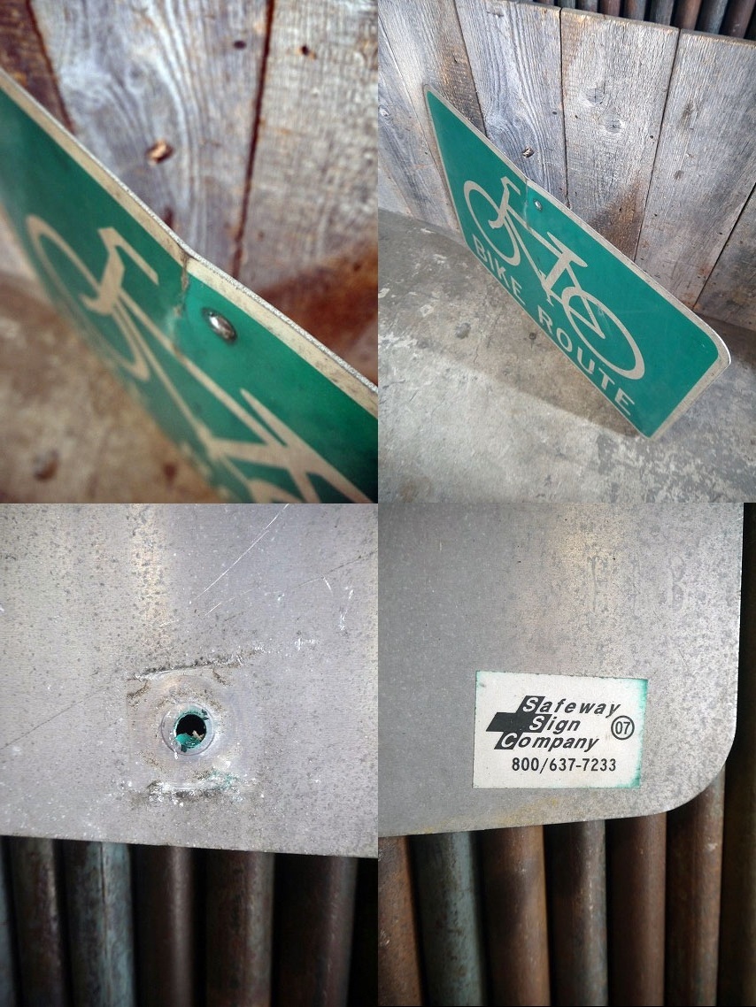 アメリカにて買い付けましたUSAのBIKE ROUTEロードサインです。グリーン×ホワイトカラーに自転車のロゴデザインがとても雰囲気があります。スチールアルミ素材のプリントデカールの反射板タイプで,裏面に07の表記ステッカーがありますので2007年製になります。ガレージやお店のディスプレイとしておすすめです。状態ですが多少の傷、上側取り付け穴付近に凹み、汚れ、表面には多少の色褪せ、左側に穴、剥がれなどはございますが、特に目立つ様なダメージはなく、ディスプレイには問題ない状態です。あくまでユーズドですのでご理解いただける方の購入をよろしくお願いします。