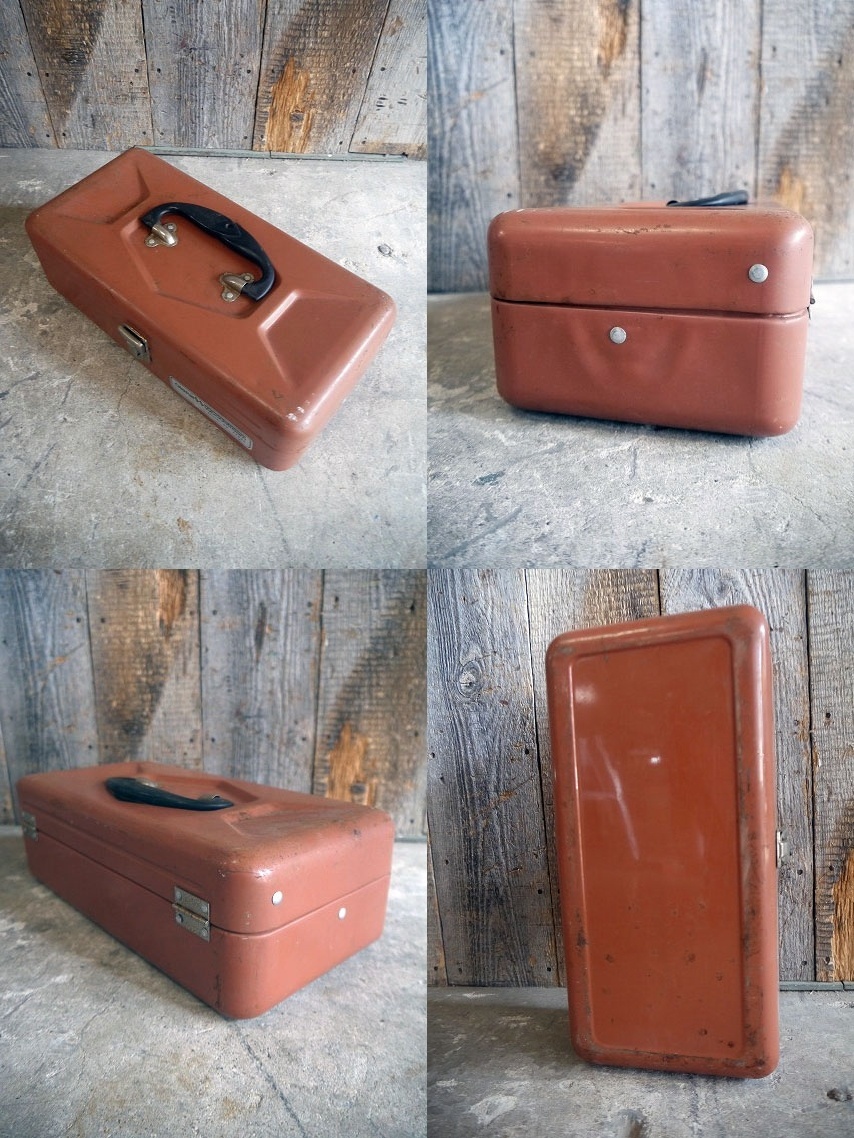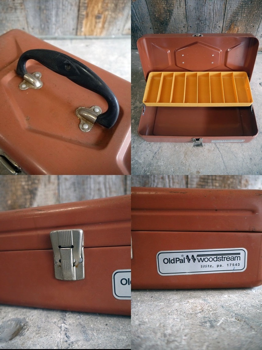 アメリカで買い付けましたビンテージのOld Pal タックルBOXです。淡いカラーにリアルなメタルの風合い&シンプルなデザインもとても雰囲気があります。野池に軽くフィッシングに行く時や、パーツや工具の保管にちょうど良いサイズです。メタル×プラスチック(持ち手&トレイ)素材で、金具部分のロックや上蓋の開閉は特に問題ありません。年代の表記はありませんがデザインから1970〜80年前後頃になるかと思います。状態ですが、経年による汚れ、擦れ、サビ等はありますが内側は綺麗で、雰囲気を損なう様な目立つダメージもなく全体的には実用にも問題ない状態です。あくまでビンテージですのでご理解いただける方のご購入をよろしくお願いします。