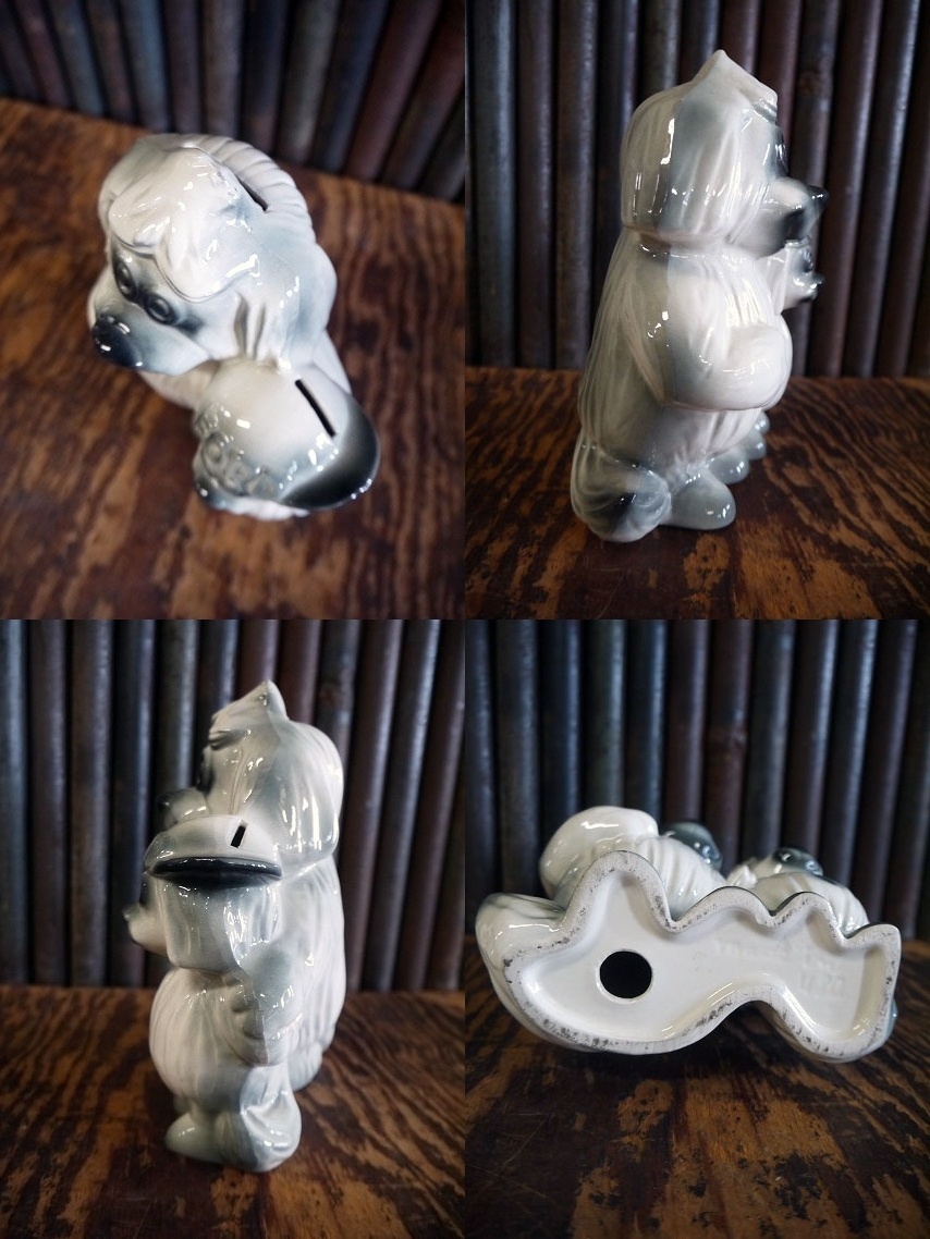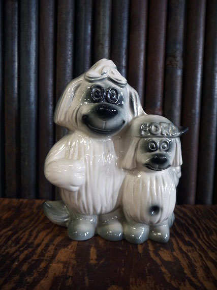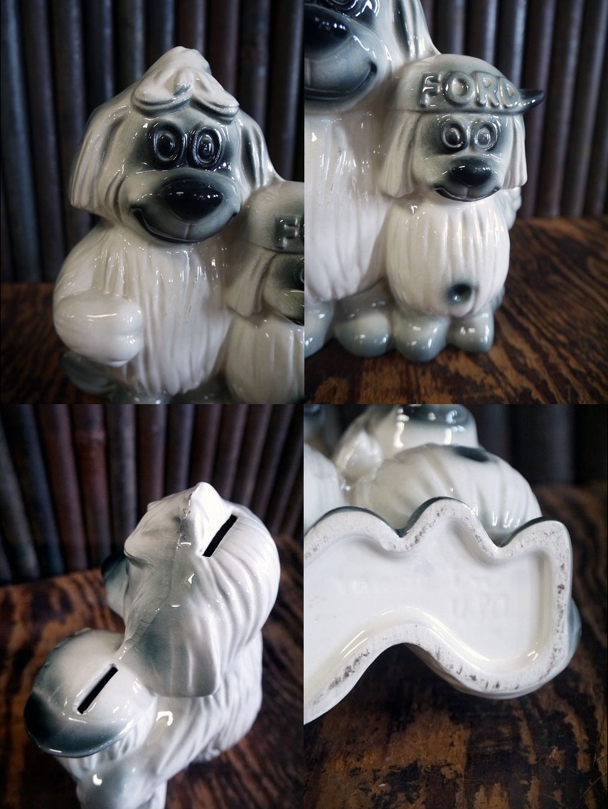 アメリカで買い付けてきましたビンテージのGalpin FORDキャラクタードール貯金箱です。人気MOTOR企業のマスコットキャラクターで、1958年から1970年代頃まで登場していた可愛いDOGモチーフのデザインになります。陶器素材で、年代の表記はありませんがデザインから1960年代前後頃かと思います。状態は経年による多少の擦れ、底面に多少の汚れや生産工程上に出来たと思われる気泡穴などはありますが、特に目立つ様なダメージも無くディスプレイに問題ない状態で良いです。あくまでビンテージのためご理解いただける方のご購入をお願いします。