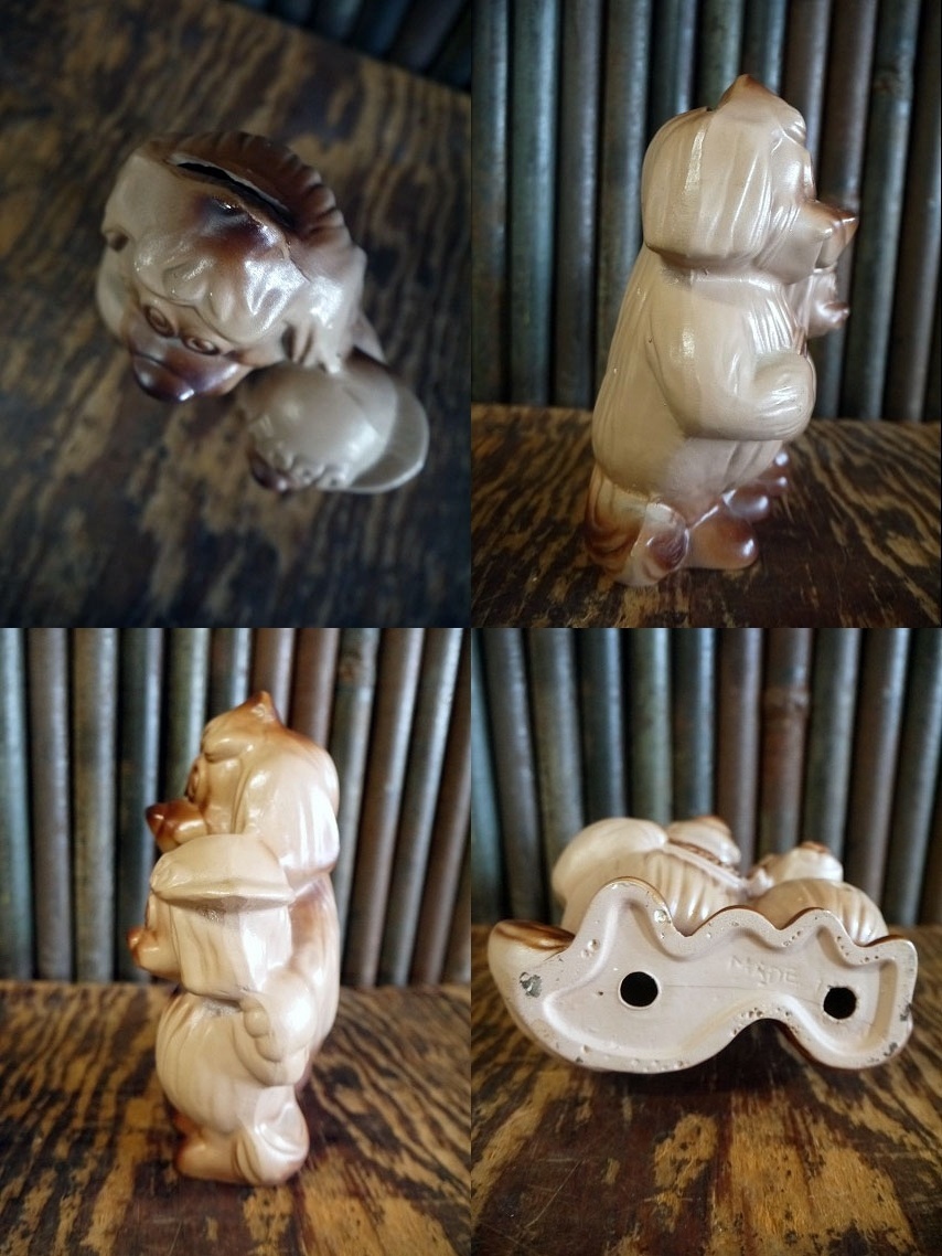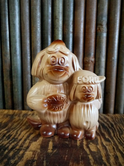 アメリカで買い付けてきましたビンテージのGalpin FORDキャラクタードール貯金箱です。人気MOTOR企業のマスコットキャラクターで、1958年から1970年代頃まで登場していた可愛いDOGモチーフのデザインになります。陶器素材で、年代の表記はありませんがデザインカラーから初期の1958年頃かと思います。状態は経年による多少の擦れ、細かい都道剥がれ、底面に多少の汚れや細かいチップなどはありますが、特に目立つ様なダメージも無くディスプレイに問題ない状態で良いです。あくまでビンテージのためご理解いただける方のご購入をお願いします。
