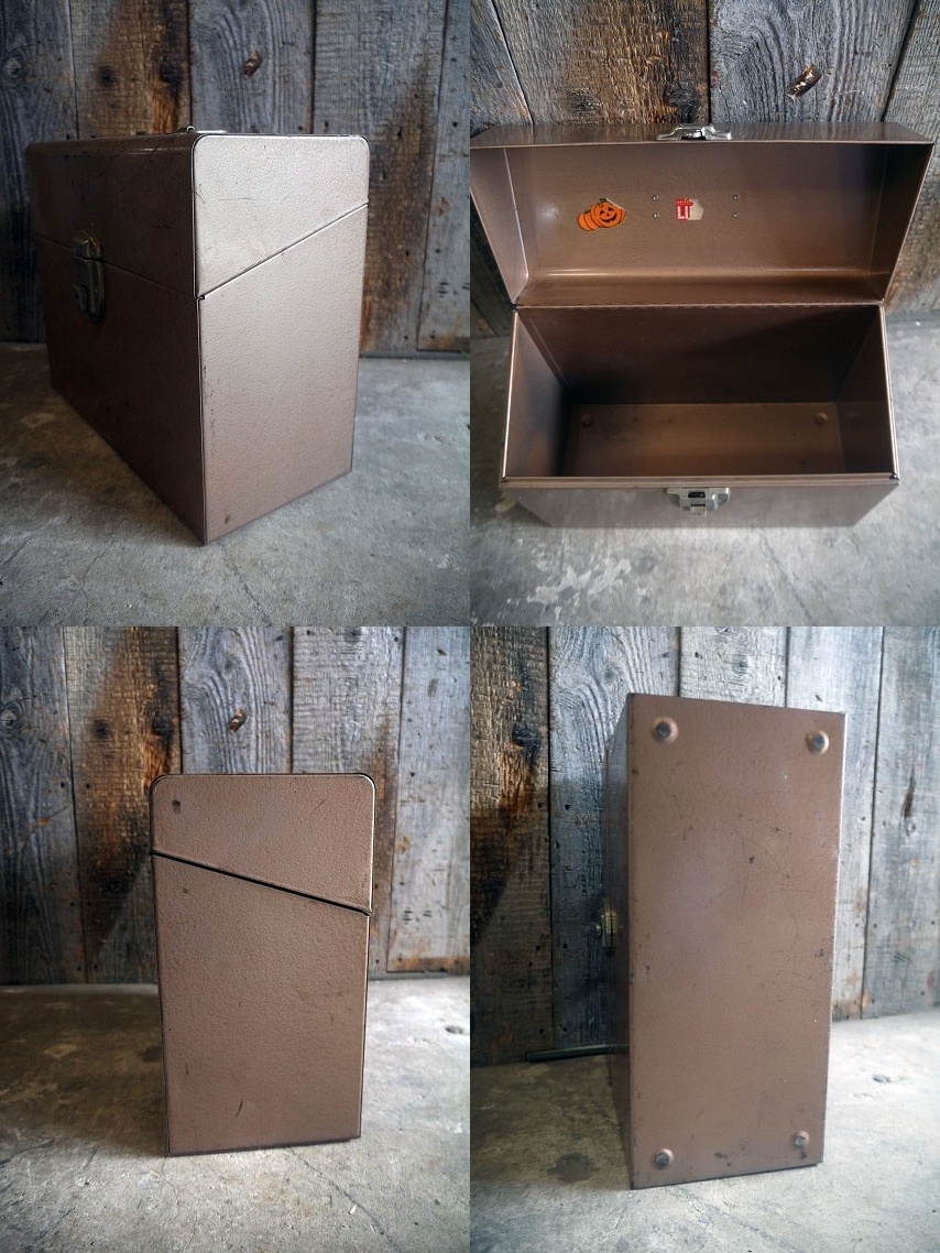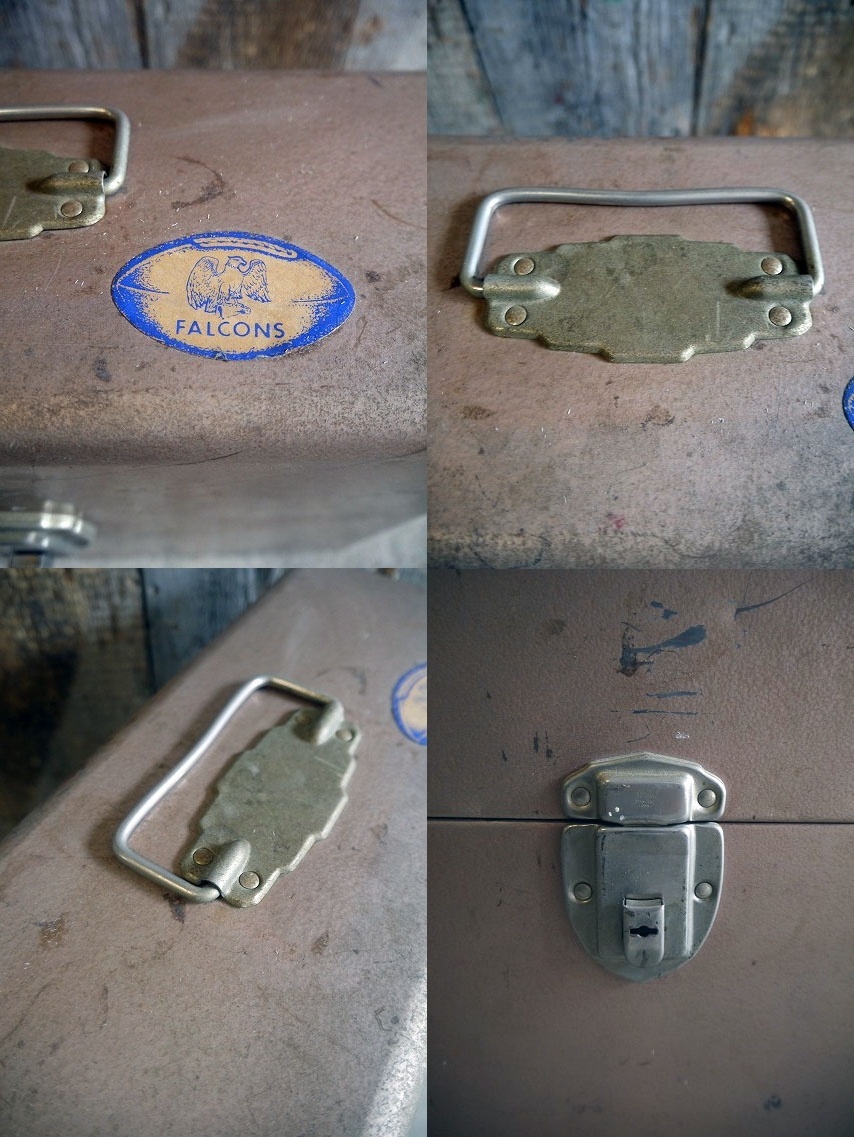 アメリカで買い付けましたビンテージのUSAファイルケースです。渋いカラーにメタルの質感&FALCONSのペーパーステッカーデザインがカッコいいです。メタル素材で、表記はありませんがデザインから1960年代頃になるかと思います。鍵はありませんが上蓋の開閉には問題ありません。お部屋等のディスプレイや収納BOXとしてもオススメです。FALCONSは当時貼り付けられたと思われます。状態ですが経年による多少の傷、擦れ、汚れ、鍵欠損、塗装剥がれや多少の凹みや上蓋に歪みなどはありますが、しっかりとした作りで、実用ディスプレイにも問題ない状態かと思います。あくまでビンテージになりますのでご理解いただける方のご購入をよろしくお願いします。