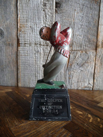 アメリカで買い付けましたビンテージのトロフィーです。ゴルファーデザインにリアルなメタルの風合いがとてもカッコいいです。金属(アルミ合金)素材で、アメリカで1954年6月20に開催されたゴルフや大会で傑出したゴルファーに贈られたと思うトロフィーになるかと思います。ディスプレイ兼コレクションとしてもおすすめのアイテムです。状態は経年経過による多少の擦れ汚れや塗装剥がれはありますが全体的にはディスプレイには問題ない程度で雰囲気のある状態です。あくまでビンテージですので理解のある方のご購入をお願いします。