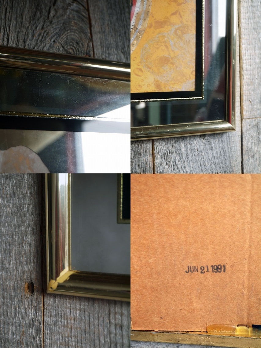 アメリカにて買い付けましたビンテージのパブミラーです。アメリカミズーリ州セントルイスに本社を持つアンハイザー・ブッシュ社のMICHELOB Golden Draft、銘柄で、ゴールドフレームにオシャレなデザインでとても雰囲気があります。裏側のスタンプ表記から1991年6月21日製になります。ゴールドフレーム(内側はウッド)×ガラス、デザイン画部分はペーパー素材で、お部屋からショップのディスプレイまで幅広くおすすめです。状態ですが経年による木枠に小傷やスレ、内側ペーパー画に多少の湾曲、多少のミラーのくすみや擦れ、傷や汚れなどはありますが目立たない程度で年代を考えるとディスプレイには問題ない状態です。あくまでビンテージのためご理解いただける方のご購入をお願いします。
