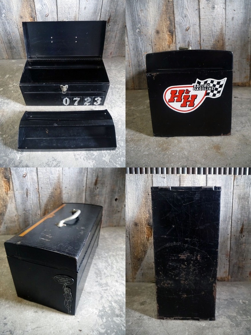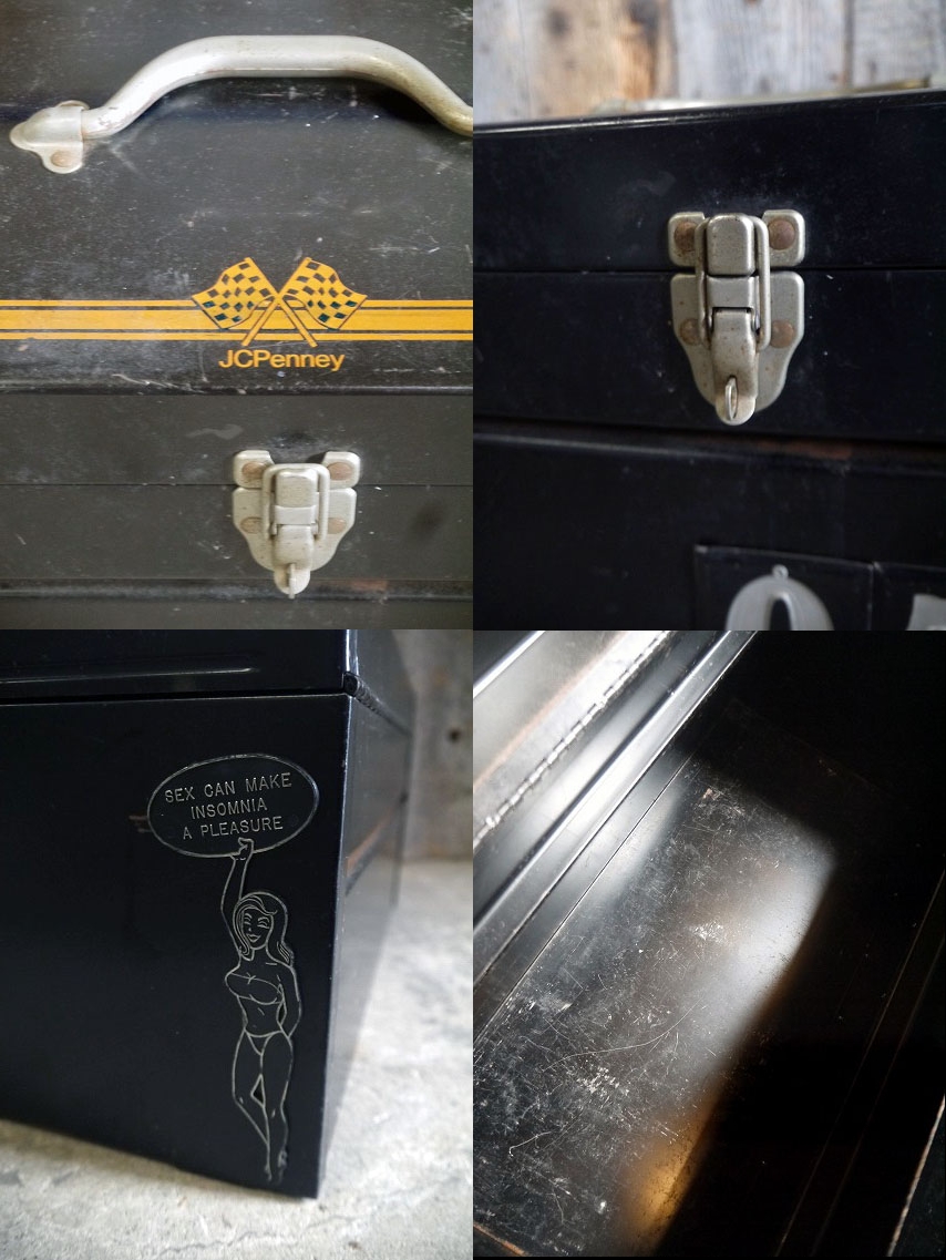 アメリカで買い付けましたビンテージのJCPennyツールBOXです。ブラックカラーにリアルなメタルの風合いとアメリカンなチェッカーフラッグ&カスタムデザインがとても雰囲気があります。野池に軽くフィッシングに行く時や、パーツや工具の保管にちょうど良いサイズです。鍵は南京錠にて施錠タイプで、開閉やロックは問題ありません。メタル素材(側面にカスタムしているピンナップガールはプラスチック)内側のトレイ付きで、年代の表記はありませんがデザインから1970年代頃かと思います。アメリカでもあまり見かけないデザインになるかと思います。状態ですが、経年による傷、擦れ、塗装剥がれやサビ汚れなどの使用感等はありますが実用は問題ない雰囲気のある状態で良いです。あくまでビンテージですのでご理解いただける方のご購入をよろしくお願いします。
