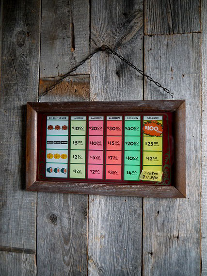 アメリカにて買い付けましたビンテージのGOLDEN NUGGET CASINO SLOT PAYMENT ガラス壁掛けです。アメリカラスベガスのカジノで使用されていたスロットマシーンの払い出しガラス面部分を壁掛けにリメイクしたもので、アメリカンなデザインがカッコイイです。ウッド×ガラス素材で、年代の表記はありませんがデザインから1950〜60年前後頃になるかと思います。店舗やお部屋のディスプレイとしておすすめです。状態は画像の様にフレーム等に多少の傷や汚れ、ガラスにくすみや汚れや剥がれ、チェーンにサビなどはありますがディスプレイには問題ない雰囲気のある状態です。ただあくまでビンテージのためご理解いただける方のご購入をお願いします。