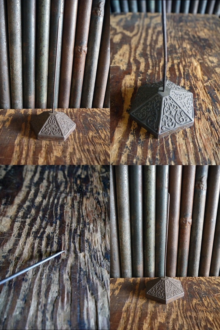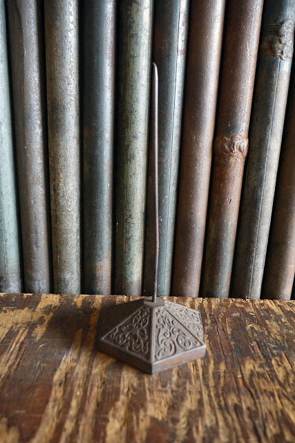 アメリカで買い付けましたアンティークのUSAレシートスパイクです。渋いメタルにビクトリア装飾が施されたデザインがとても雰囲気があります。メタル×キャストアイアンベース素材で、1900年代初頭〜1920年代頃のレジスターのペーパーホルダーで、レジ横等に置かれて使用されていたものになります。状態ですが全体的に傷や針や針先に歪み、サビ汚れなどの使用感などはございますが、ディスプレイには問題ない雰囲気のある状態です。ただあくまでアンティークになりますのでご理解いただける方のご購入をお願いします。