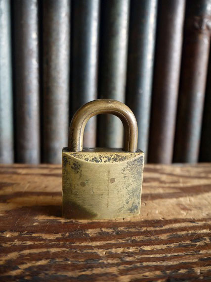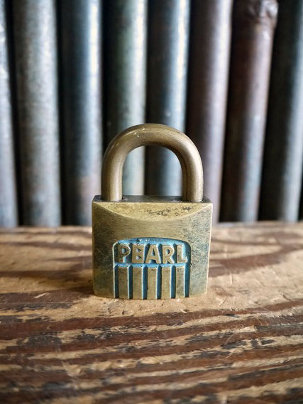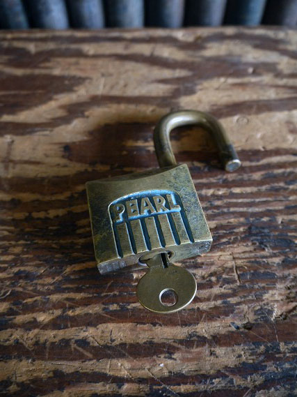 アメリカで買い付けましたビンテージのPEARLパドロック(南京錠)です。重厚感のあるしっかりとした作りにリアルなメタルの風合い&ロゴデザインがカッコいいです。真鍮製で、オリジナルの鍵が1個付いていて、今の所開閉にも問題なく実際に使用も可能ですが、鍵を開ける際のバネは利いていませんので、上側部分を持ち上げると錠前が開きます。古いアイテムになりますので、そのまま置いたり、壁に掛けてディスプレイしていただいても十分お洒落です。底面にMADE IN OCCUPIED JAPAN の刻印が日本が連合国軍の占領下にあった当時の輸出製品に義務付けらえていた表記で、1947年〜49年の2年間のみとされているコレクタブルなアイテムになります。状態ですが全体的に傷や擦れ、サビ汚れ、使用感などはございますが致命的なダメージもなく使用、ディスプレイに共に問題ないレベルだと思います。ただあくまでビンテージになりますのでご理解いただける方のご購入をお願いします。